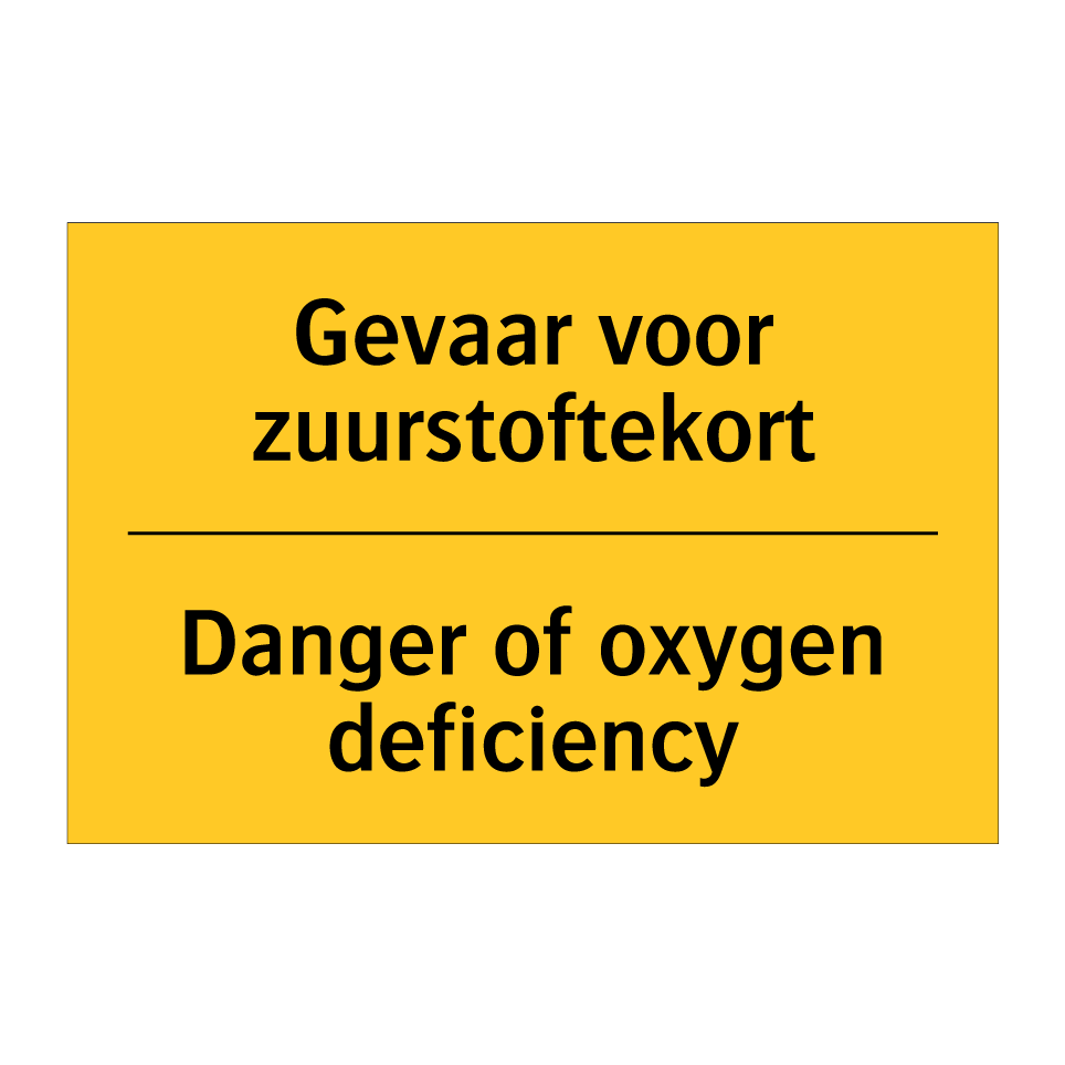 Dit waarschuwingsbord met gele achtergrond en zwarte tekst is essentieel voor het signaleren van zuurstoftekort. De tweetalige tekst in zowel Nederlands als Engels zorgt ervoor dat een breed publiek de boodschap begrijpt, wat de veiligheid verhoogt. dit bordje is ideaal voor gebruik in industriële omgevingen, laboratoria, en andere ruimtes waar zuurstofniveaus kritisch kunnen zijn. Plaats het op zichtbare locaties zoals ingangen, gangen, en werkruimtes om personeel en bezoekers te waarschuwen voor mogelijke gevaren. Dit waarschuwingsbord helpt ongelukken te voorkomen en bevordert een veilige werkomgeving.
