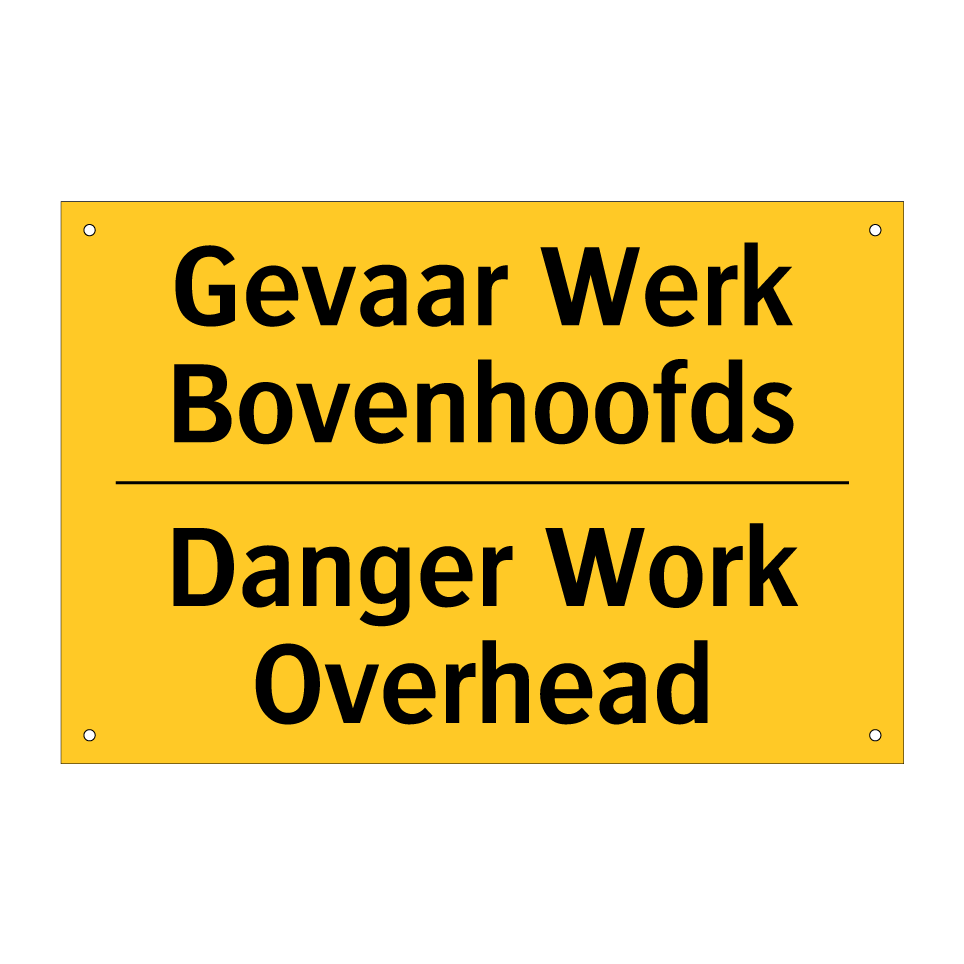 Waarschuwingsbord met de tekst Gevaar Werk Bovenhoofds / Danger Work Overhead