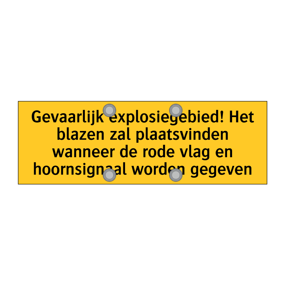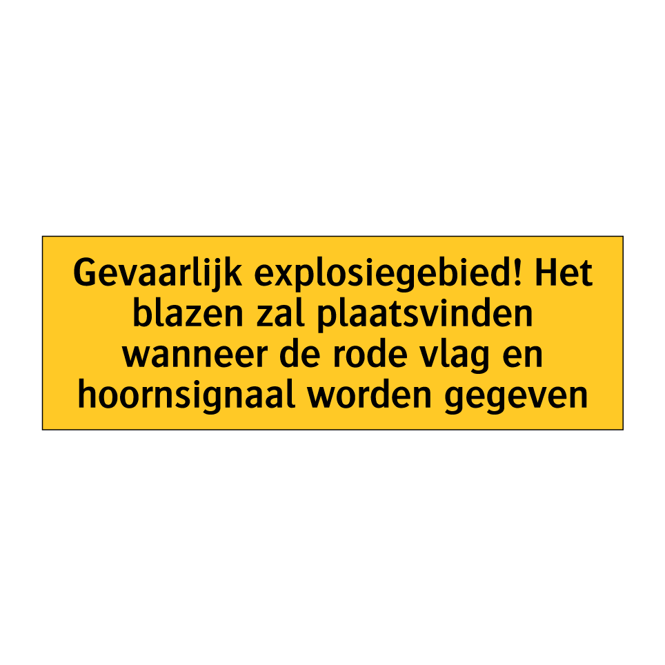 Waarschuwingsbord met de tekst Gevaarlijk explosiegebied! Het blazen zal plaatsvinden wanneer de rode vlag en hoornsignaal worden gegeven