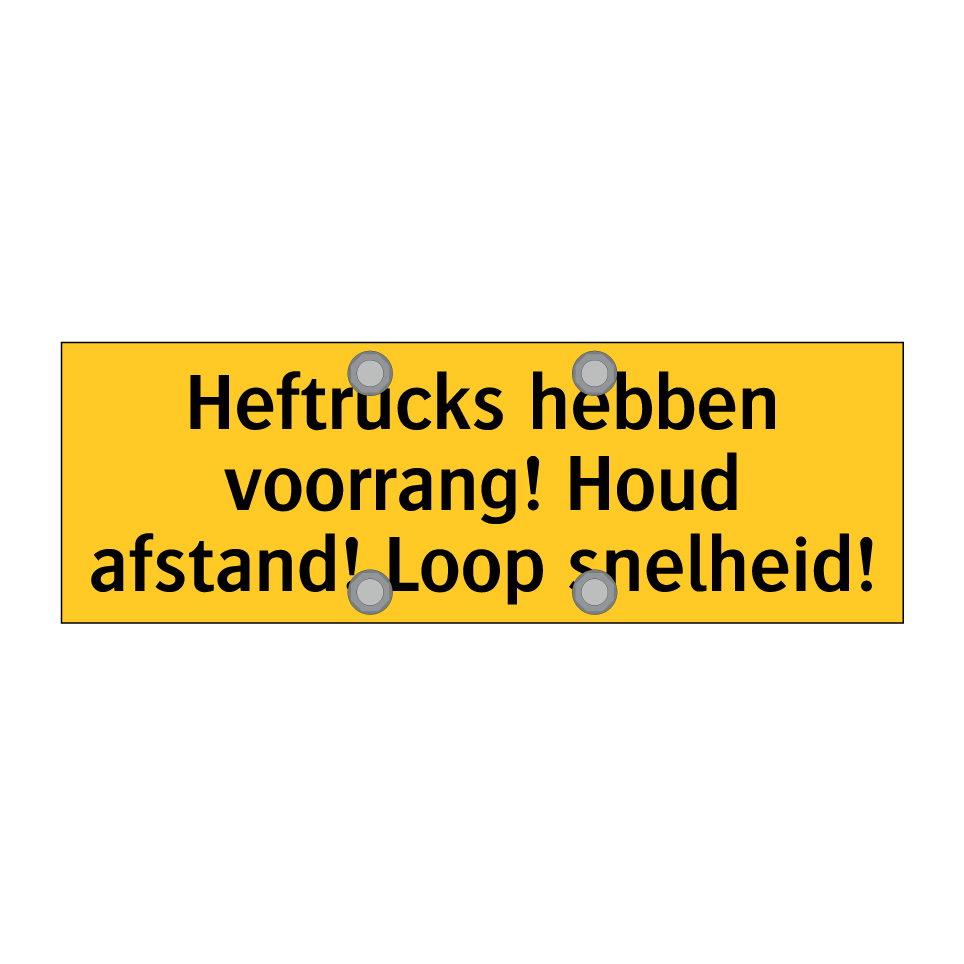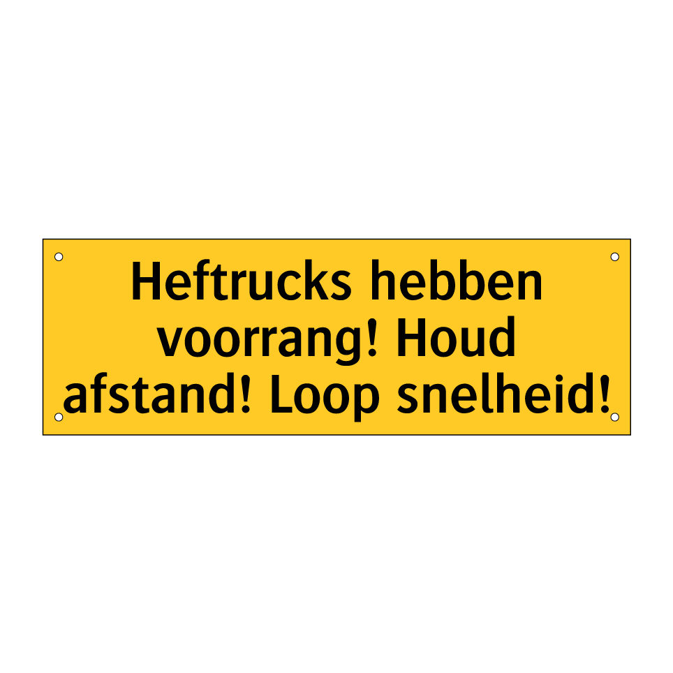 Waarschuwingsbord met de tekst Heftrucks hebben voorrang! Houd afstand! Loop snelheid!