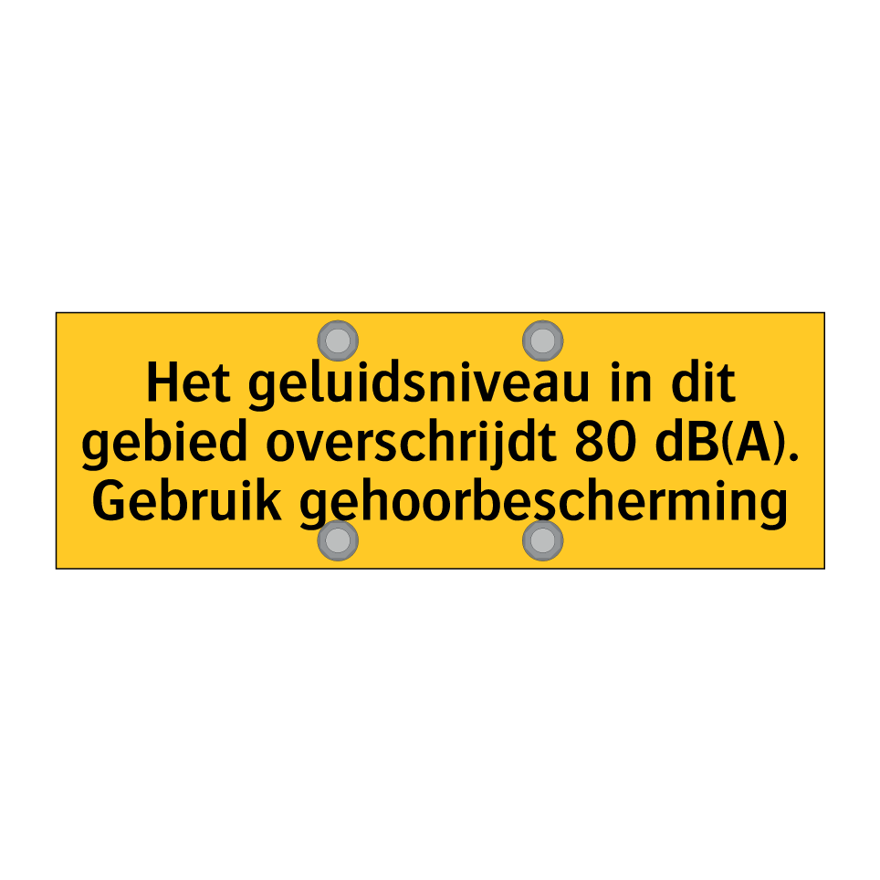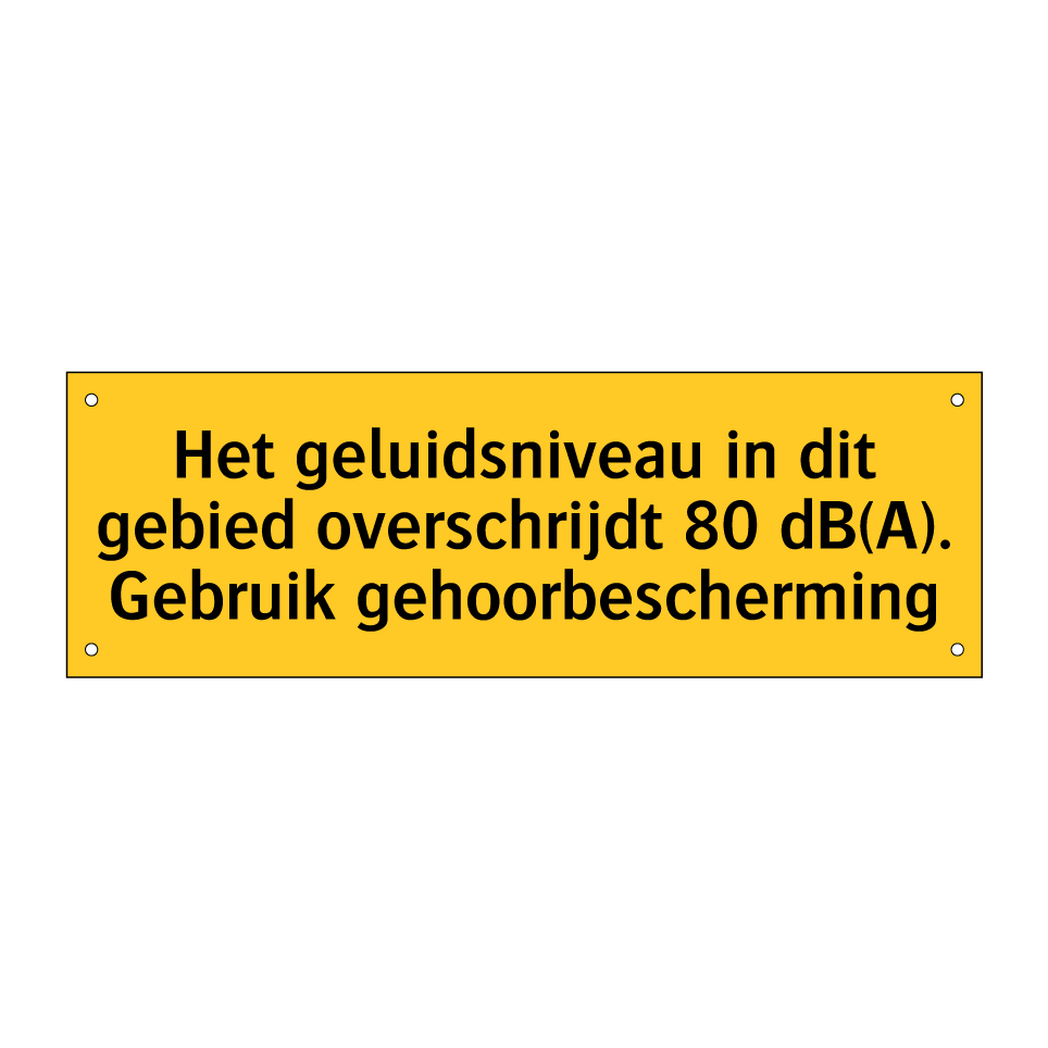 Waarschuwingsbord met de tekst Het geluidsniveau in dit gebied overschrijdt 80 dB(A). Gebruik gehoorbescherming