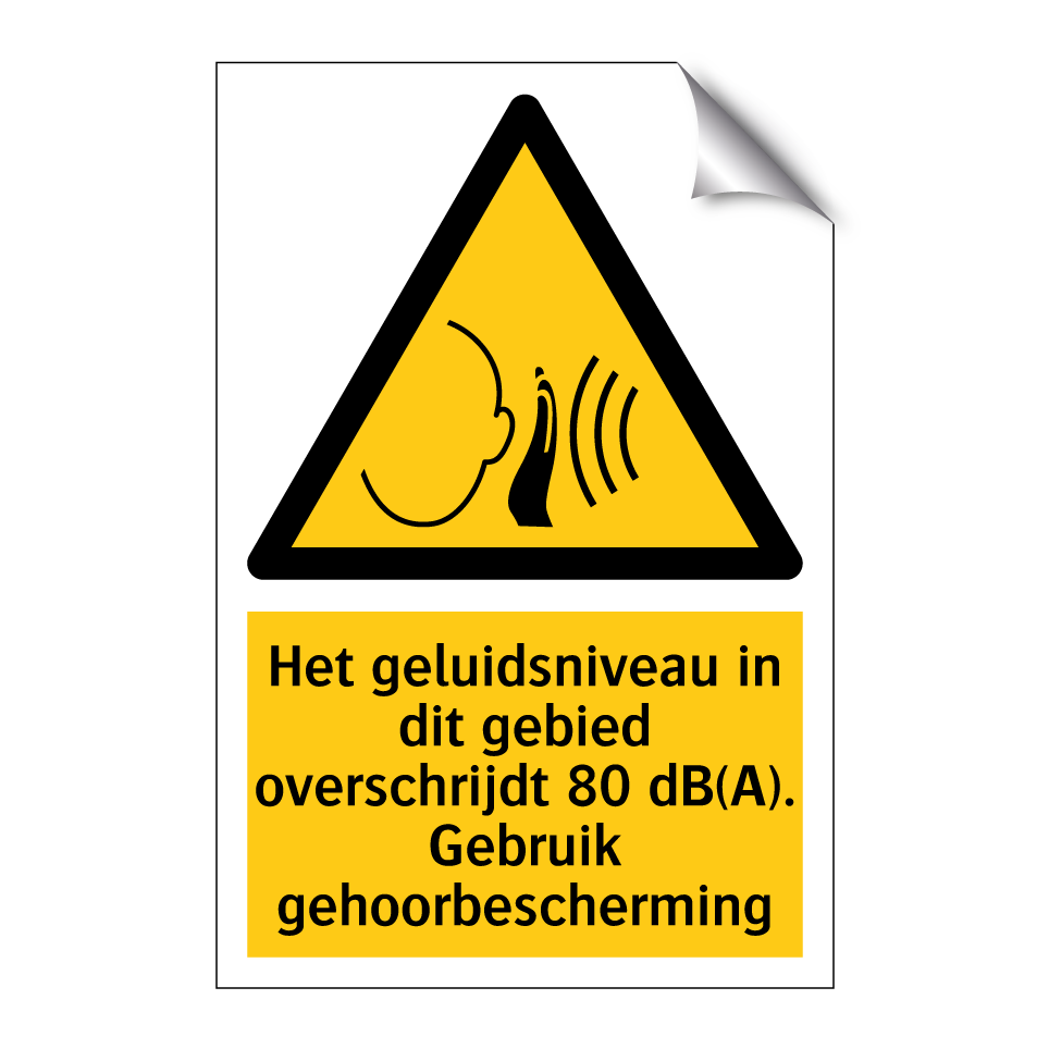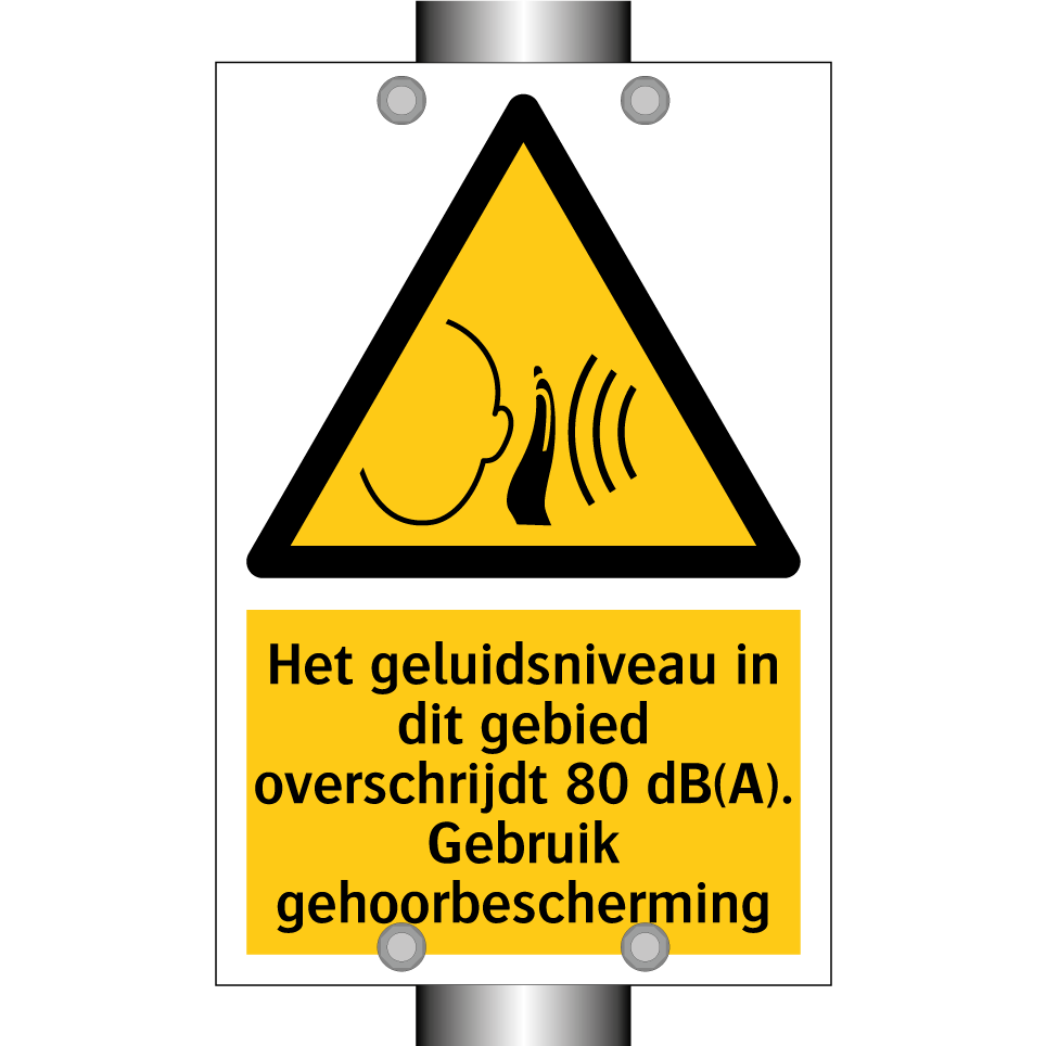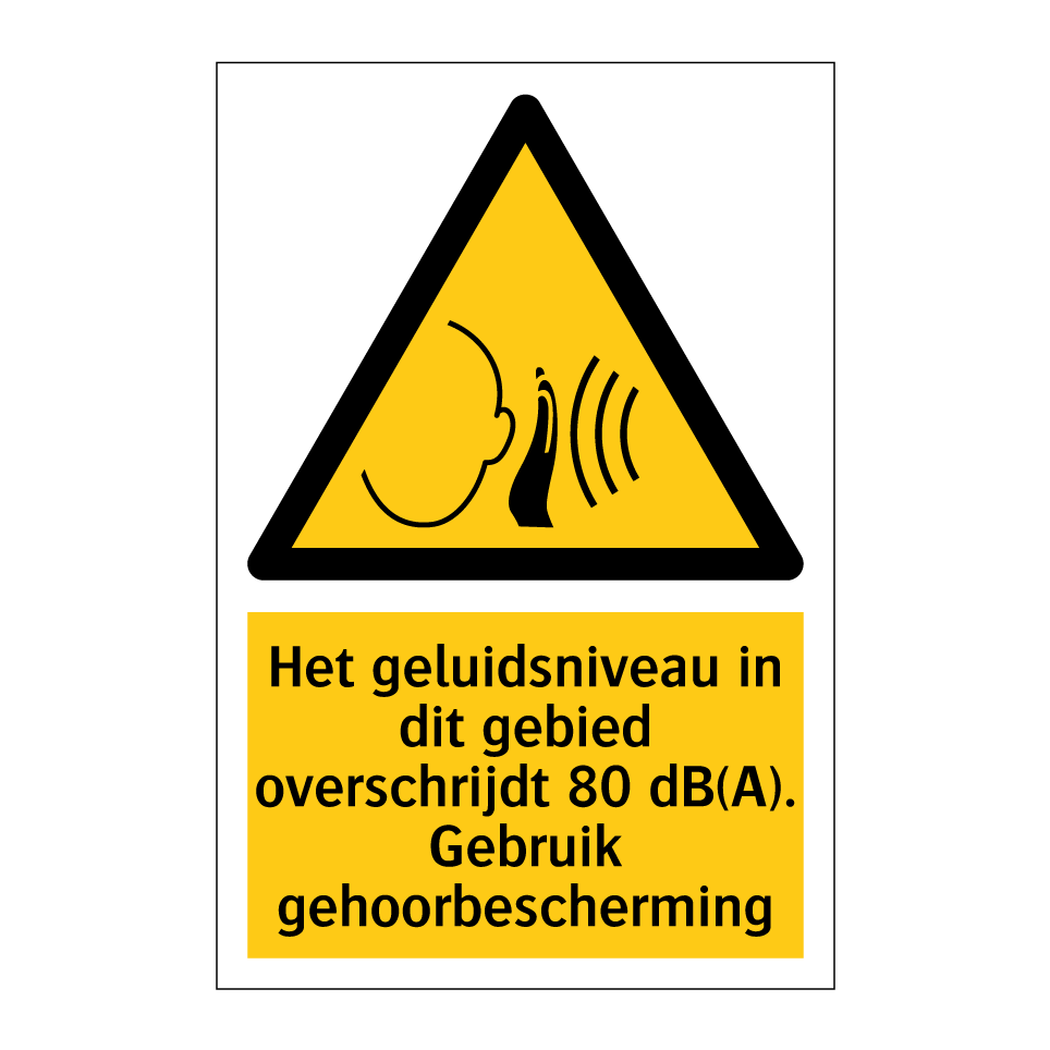 Waarschuwingsbord met de tekst Het geluidsniveau in dit gebied overschrijdt 80 dB(A). Gebruik gehoorbescherming