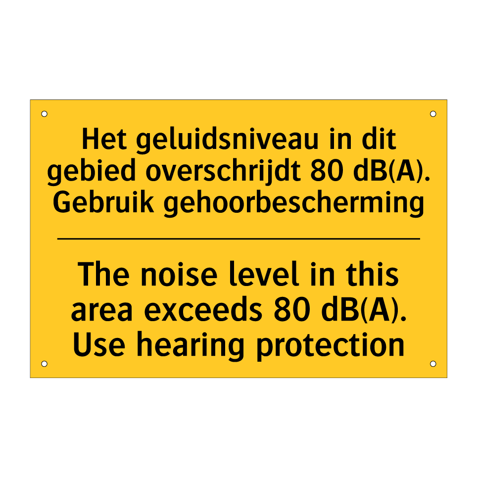 Waarschuwingsbord met de tekst Het geluidsniveau in dit gebied overschrijdt 80 dB(A). Gebruik gehoorbescherming / The noise level in this area exceeds 80 dB(A). Use hearing protection
