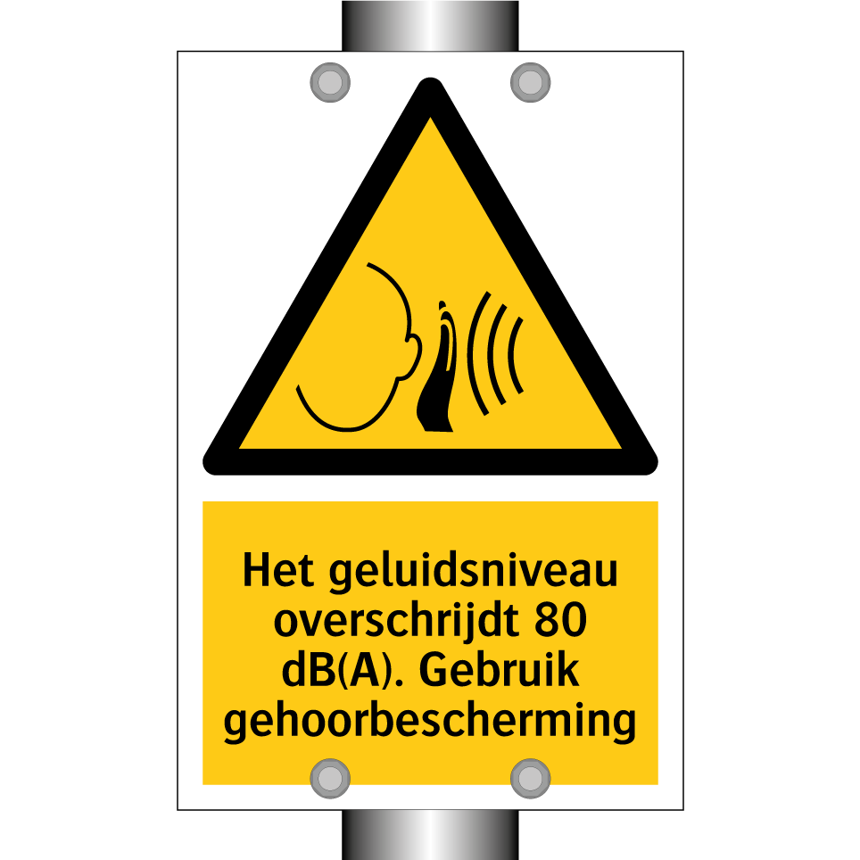Waarschuwingsbord met de tekst Het geluidsniveau overschrijdt 80 dB(A). Gebruik gehoorbescherming