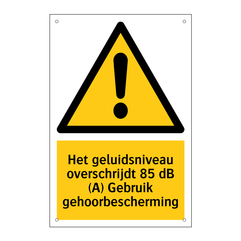 Waarschuwingsbord met de tekst Het geluidsniveau overschrijdt 85 dB (A) Gebruik gehoorbescherming