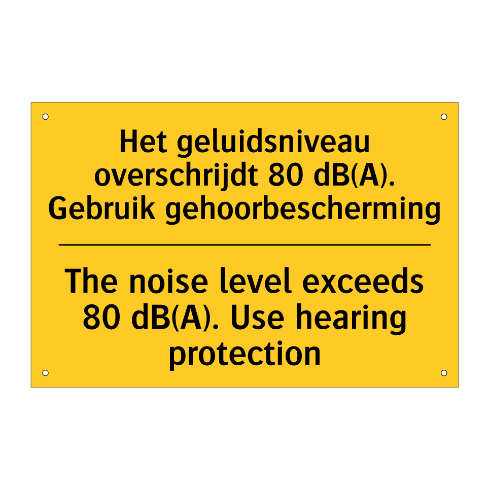 Dit waarschuwingsbord is essentieel voor het waarborgen van de veiligheid in omgevingen met hoge geluidsniveaus. Met een opvallende gele achtergrond en zwarte tekst, trekt dit bordje onmiddellijk de aandacht en informeert het personeel en bezoekers over het overschrijden van de 80 dB(A) geluidsgrens. Dit tweetalige bord, met tekst in zowel het Nederlands als het Engels, is ideaal voor internationale werkplekken en zorgt ervoor dat iedereen de boodschap begrijpt. Plaats dit waarschuwingsbord in fabrieken, werkplaatsen, bouwplaatsen of andere lawaaierige omgevingen om gehoorbescherming te promoten en gehoorschade te voorkomen. Het gebruik van dit bordje helpt bij het naleven van veiligheidsvoorschriften en het creëren van een veilige werkomgeving.