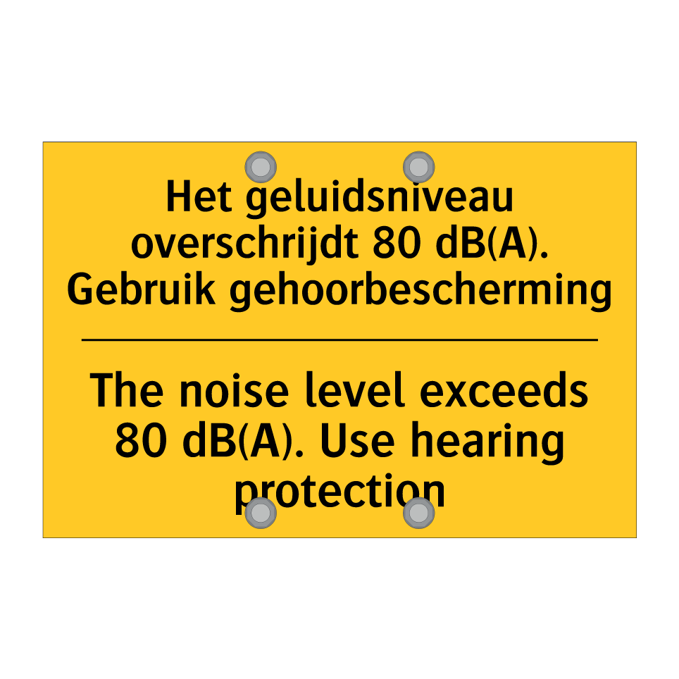 Waarschuwingsbord met de tekst Het geluidsniveau overschrijdt 80 dB(A). Gebruik gehoorbescherming / The noise level exceeds 80 dB(A). Use hearing protection