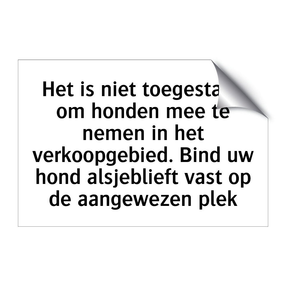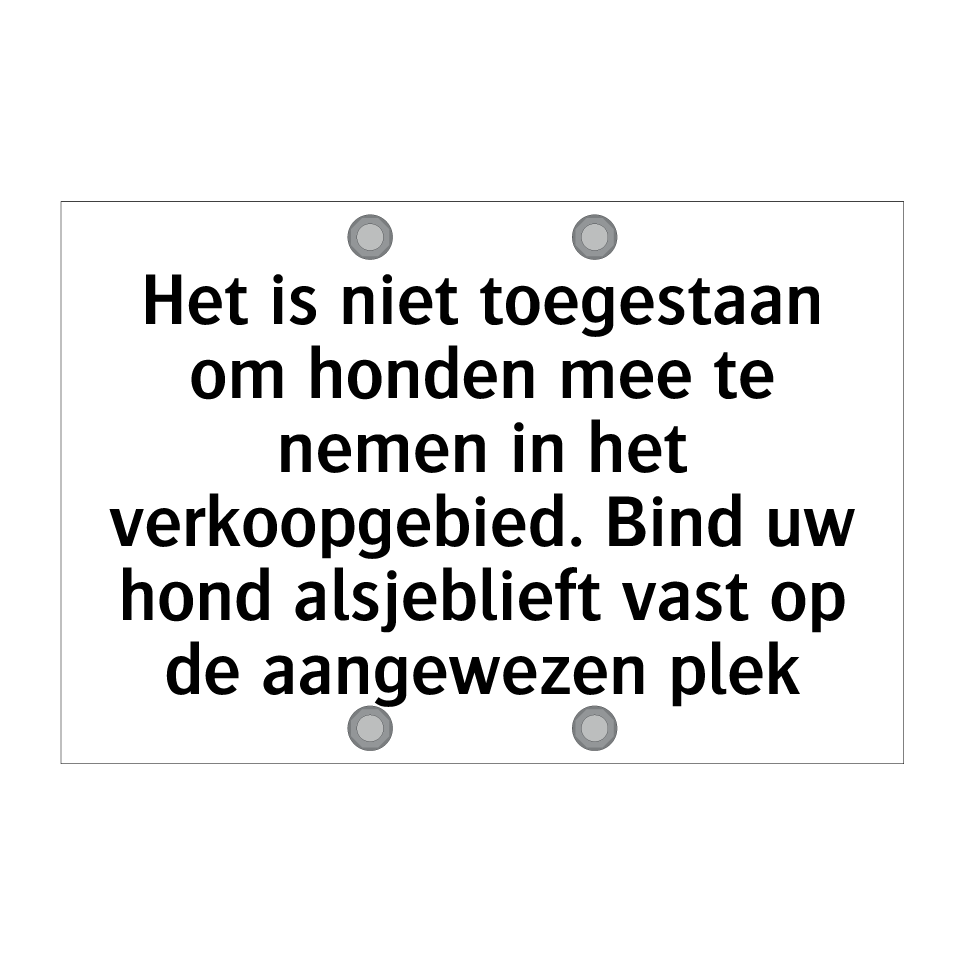 Verbodsbord met de tekst Het is niet toegestaan om honden mee te nemen in het verkoopgebied. Bind uw hond alsjeblieft vast op de aangewezen plek