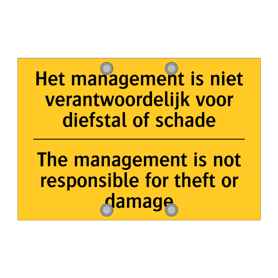 Waarschuwingsbord met de tekst Het management is niet verantwoordelijk voor diefstal of schade / The management is not responsible for theft or damage