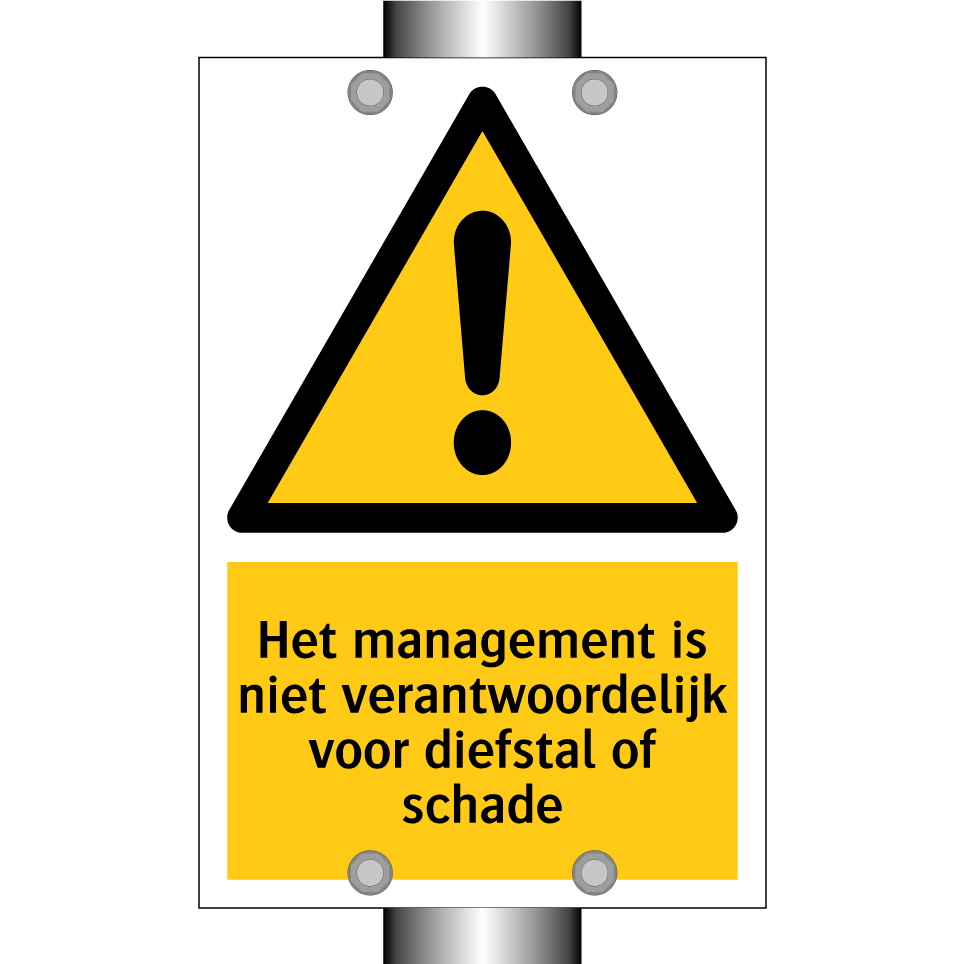 Waarschuwingsbord met de tekst Het management is niet verantwoordelijk voor diefstal of schade