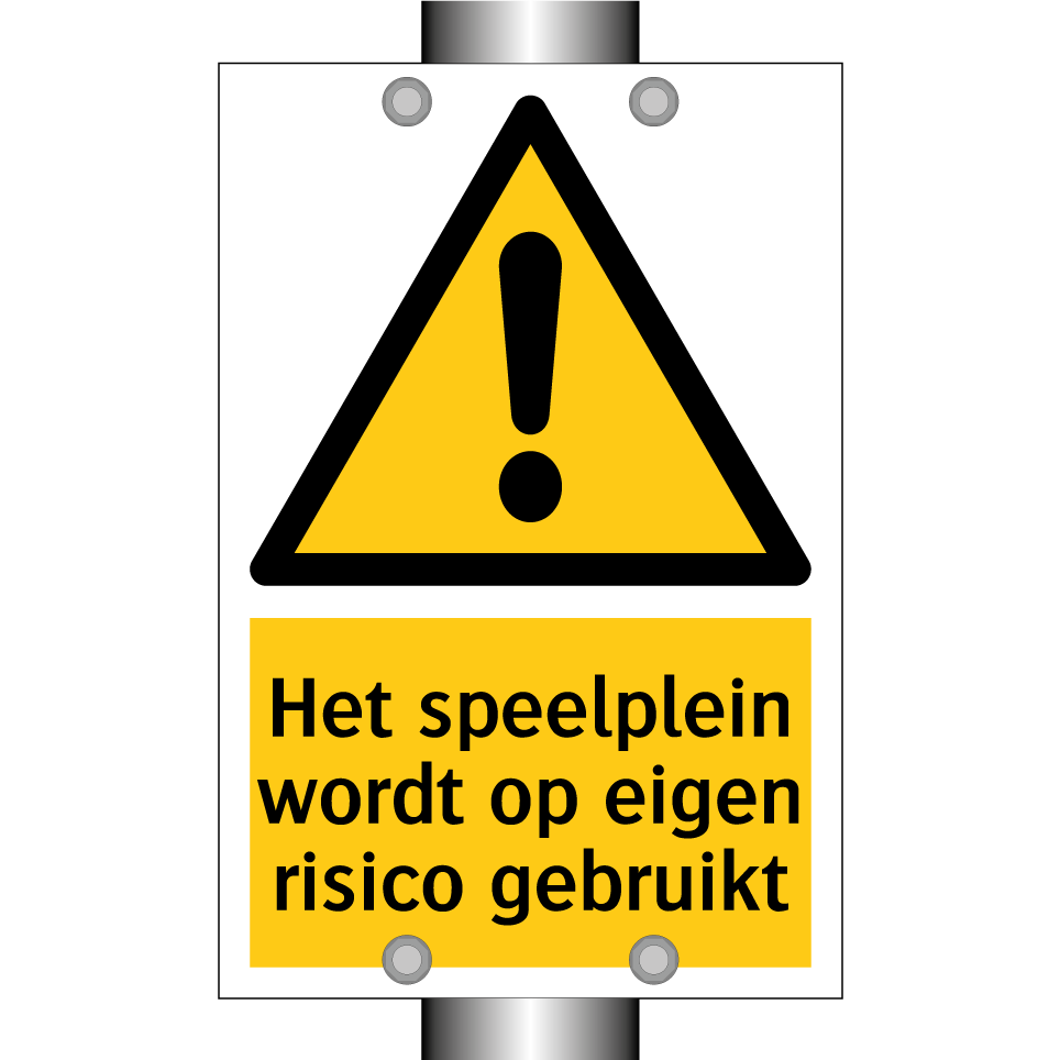 Waarschuwingsbord met de tekst Het speelplein wordt op eigen risico gebruikt