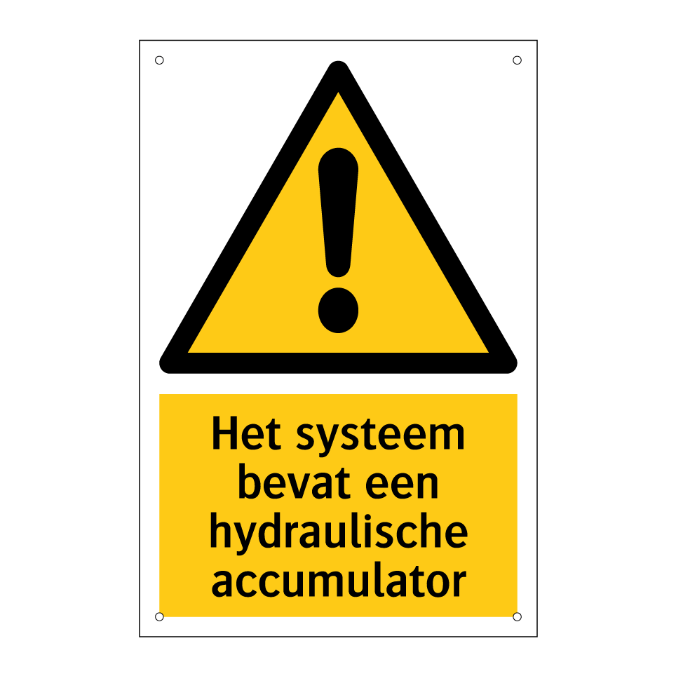 Waarschuwingsbord met de tekst Het systeem bevat een hydraulische accumulator