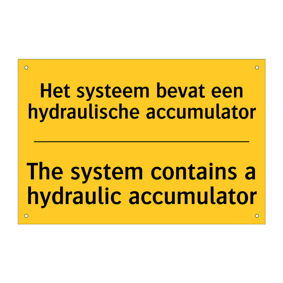 Waarschuwingsbord met de tekst Het systeem bevat een hydraulische accumulator / The system contains a hydraulic accumulator