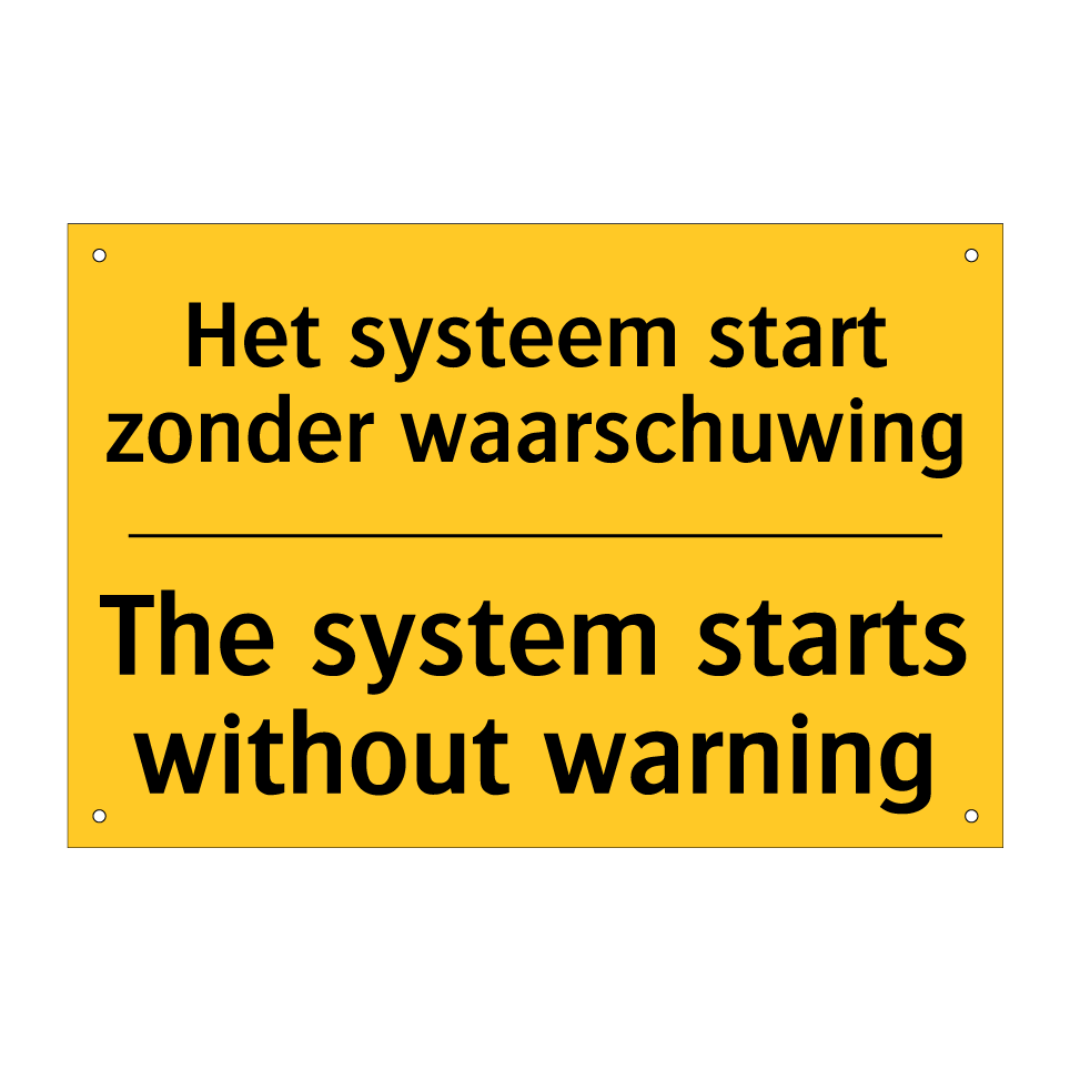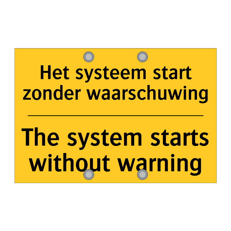 Waarschuwingsbord met de tekst Het systeem start zonder waarschuwing / The system starts without warning