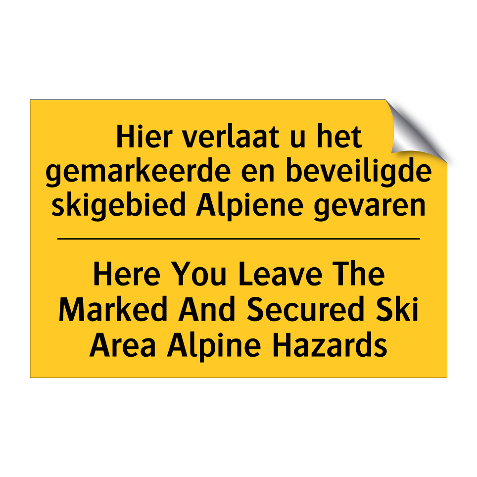 Waarschuwingsbord met de tekst Hier verlaat u het gemarkeerde en beveiligde skigebied Alpiene gevaren / Here You Leave The Marked And Secured Ski Area Alpine Hazards
