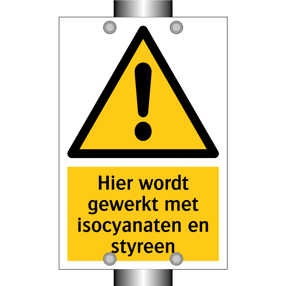 Waarschuwingsbord met de tekst Hier wordt gewerkt met isocyanaten en styreen