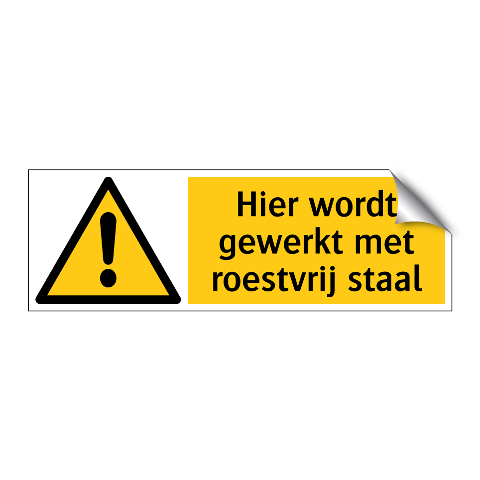 Waarschuwingsbord met de tekst Hier wordt gewerkt met roestvrij staal