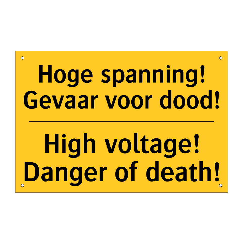 Waarschuwingsbord met de tekst Hoge spanning! Gevaar voor dood! / High voltage! Danger of death!