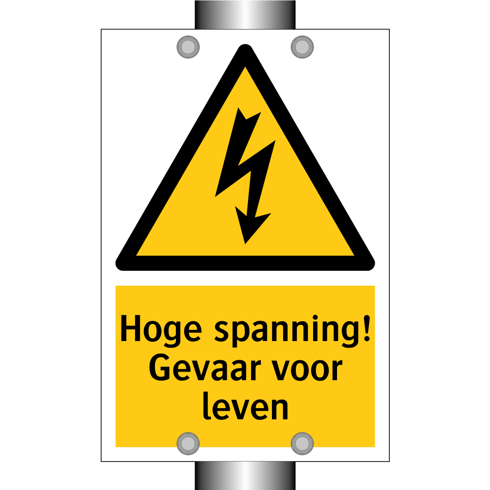 Waarschuwingsbord met de tekst Hoge spanning! Gevaar voor leven