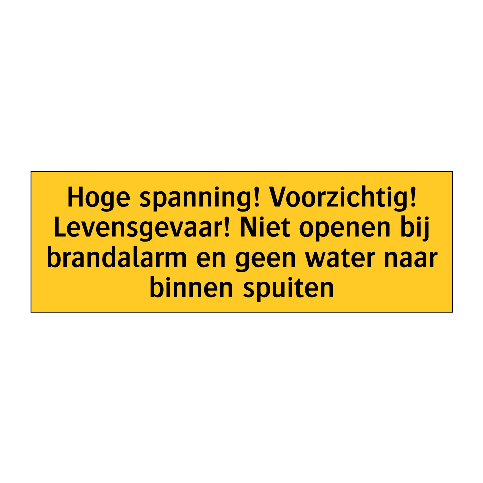 Waarschuwingsbord met de tekst Hoge spanning! Voorzichtig! Levensgevaar! Niet openen bij brandalarm en geen water naar binnen spuiten