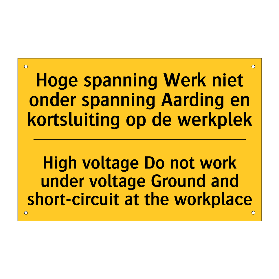 Waarschuwingsbord met de tekst Hoge spanning Werk niet onder spanning Aarding en kortsluiting op de werkplek / High voltage Do not work under voltage Ground and short-circuit at the workplace
