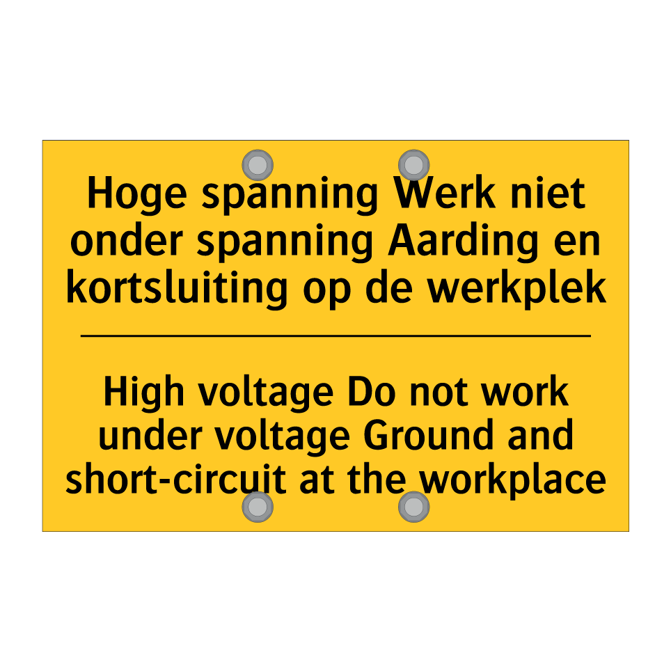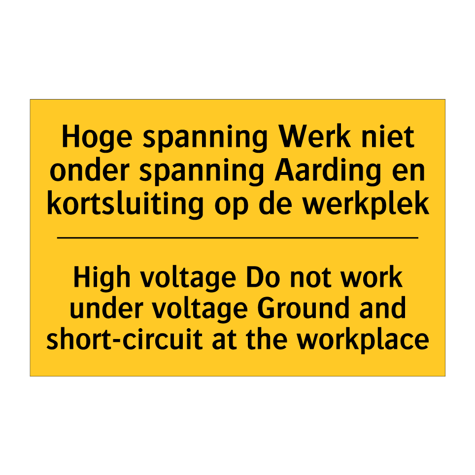 Dit waarschuwingsbord met gele achtergrond en zwarte tekst is essentieel voor de veiligheid op de werkplek. De tweetalige tekst in zowel Nederlands als Engels zorgt ervoor dat iedereen de boodschap begrijpt, wat de veiligheid verhoogt. dit bordje is ideaal voor gebruik in omgevingen met hoge spanning, zoals elektrische installaties en industriële werkplaatsen. Plaats het op zichtbare locaties waar werknemers worden herinnerd aan de gevaren van werken onder spanning en de noodzaak van aarding en kortsluiting. Dit waarschuwingsbord helpt ongelukken te voorkomen en zorgt voor een veilige werkomgeving.