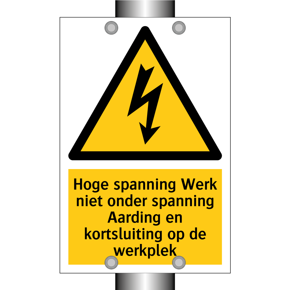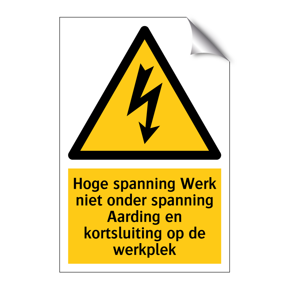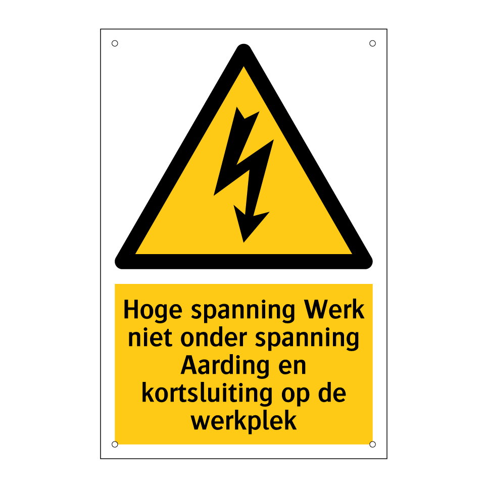 Waarschuwingsbord met de tekst Hoge spanning Werk niet onder spanning Aarding en kortsluiting op de werkplek