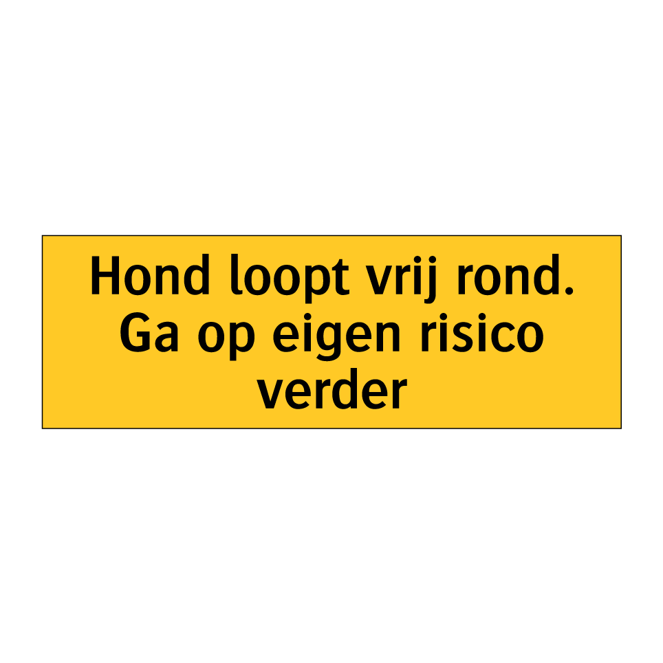 Waarschuwingsbord met de tekst Hond loopt vrij rond. Ga op eigen risico verder