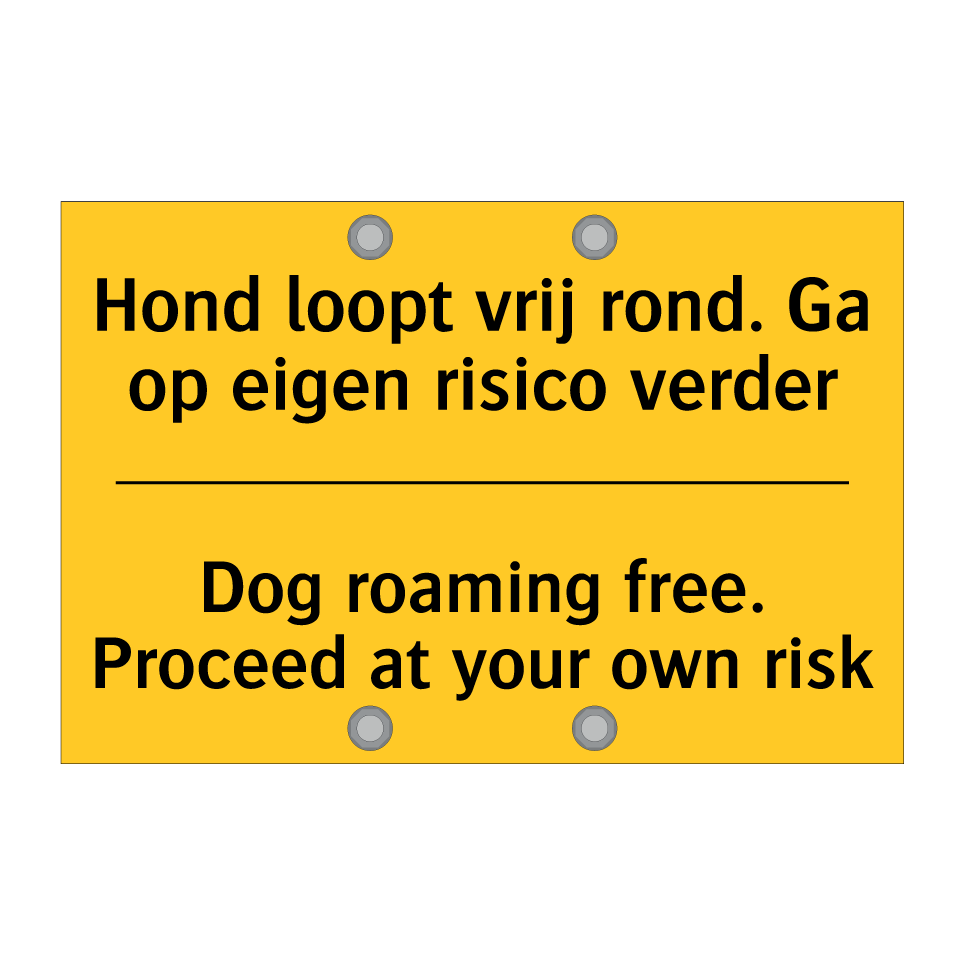 Waarschuwingsbord met de tekst Hond loopt vrij rond. Ga op eigen risico verder / Dog roaming free. Proceed at your own risk