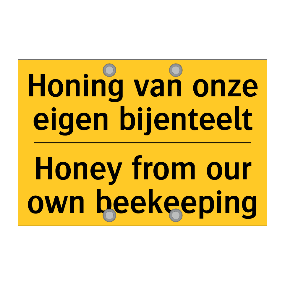 Waarschuwingsbord met de tekst Honing van onze eigen bijenteelt / Honey from our own beekeeping