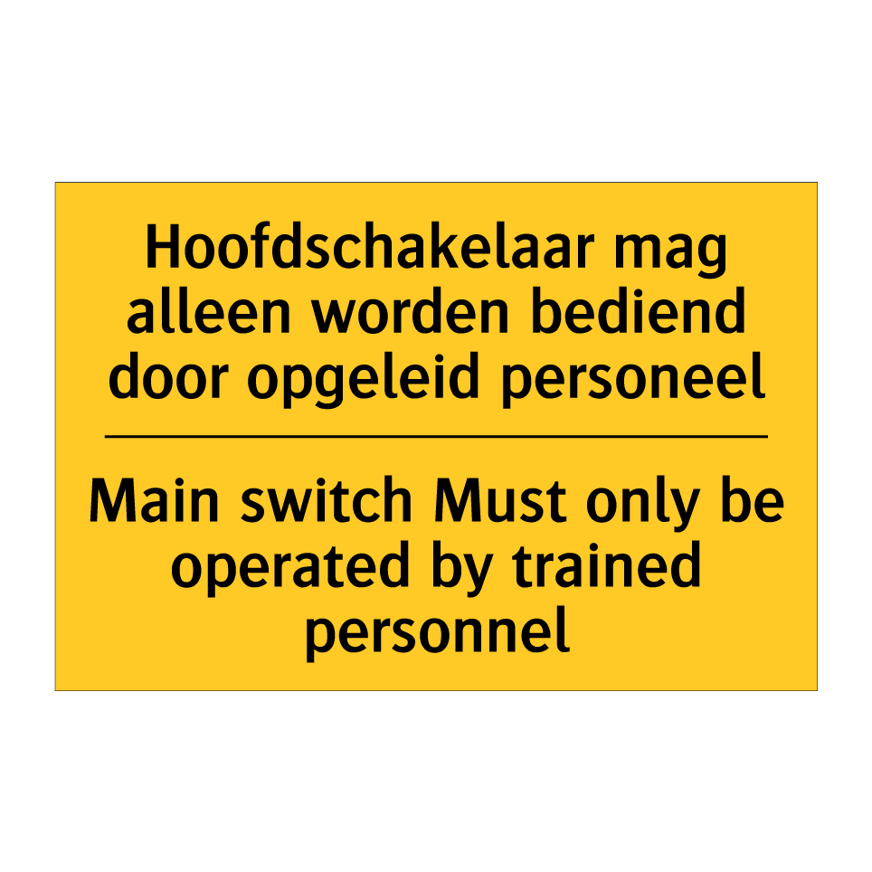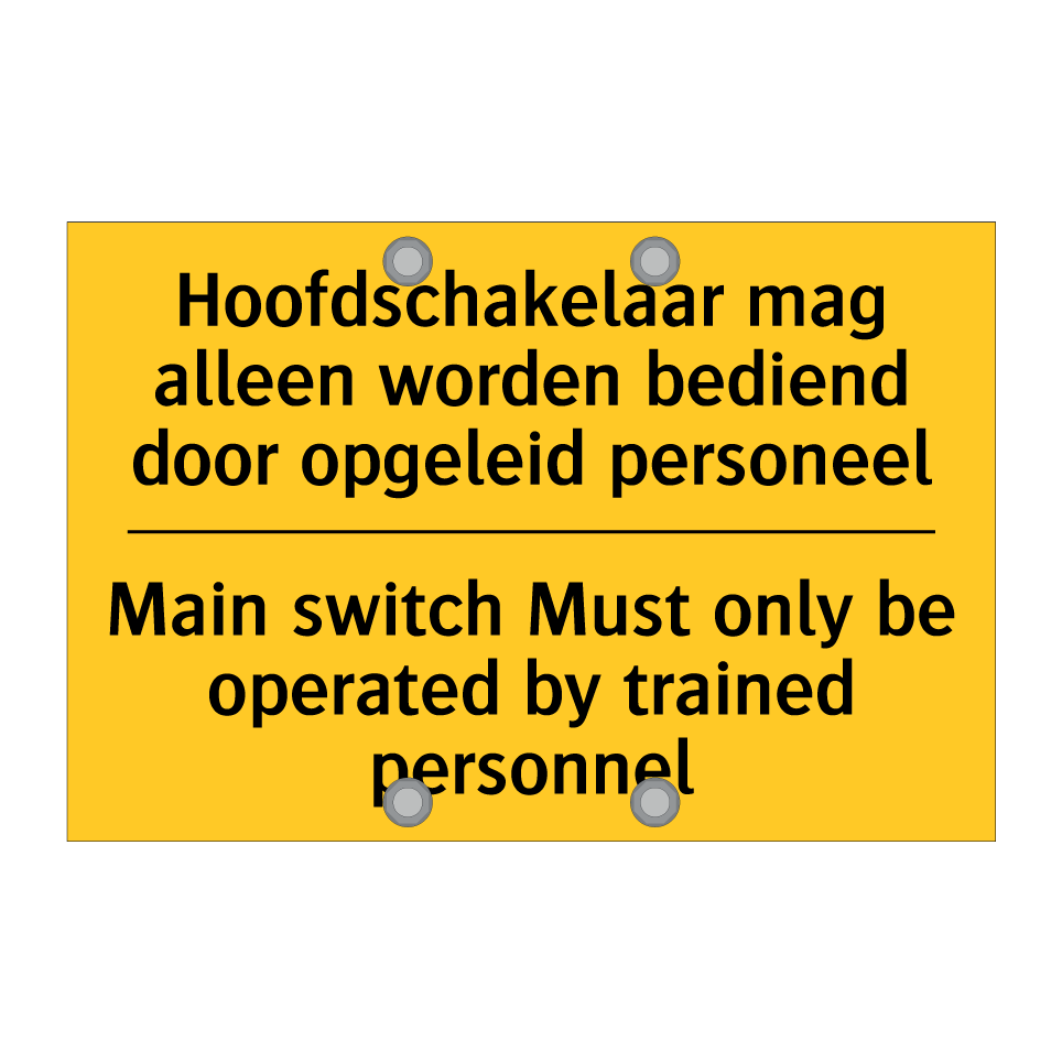 Waarschuwingsbord met de tekst Hoofdschakelaar mag alleen worden bediend door opgeleid personeel / Main switch Must only be operated by trained personnel