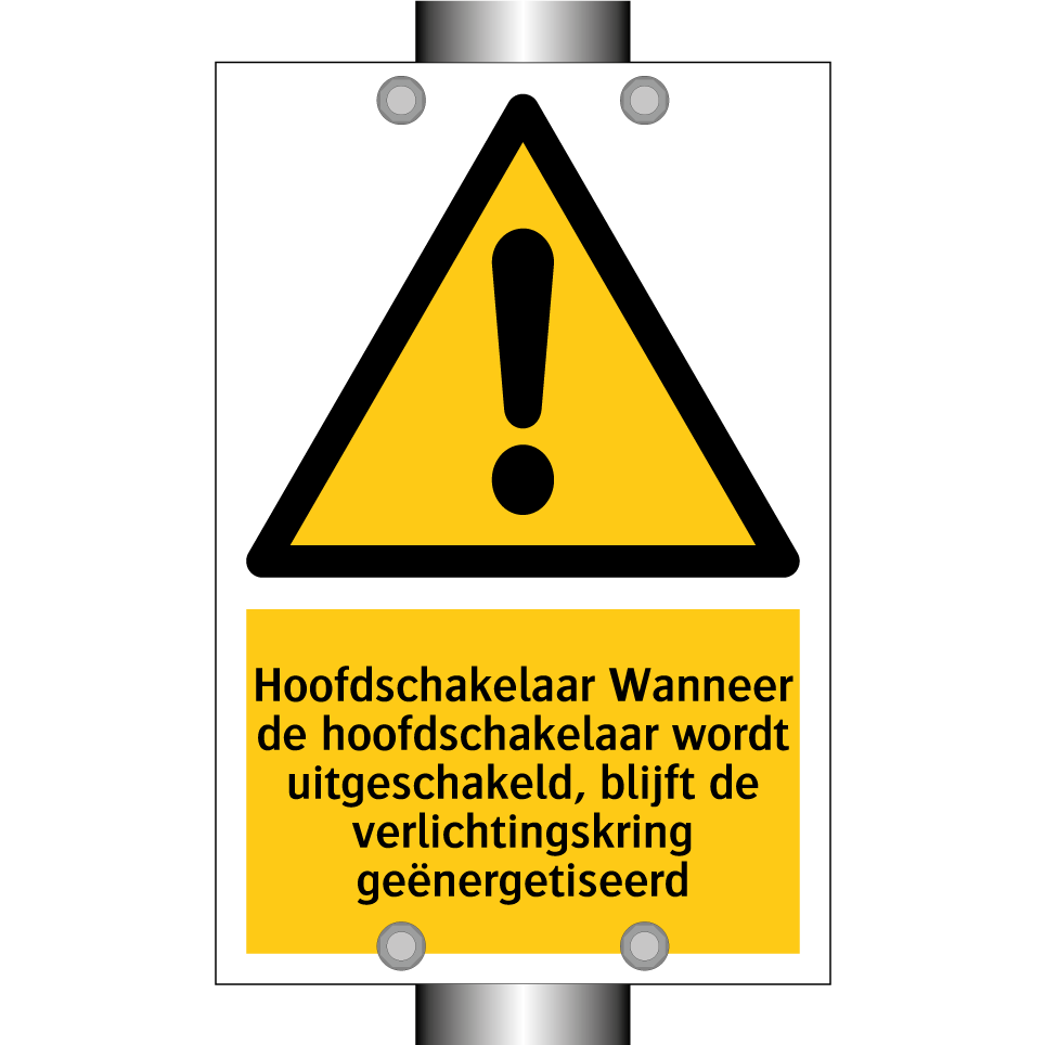 Waarschuwingsbord met de tekst Hoofdschakelaar Wanneer de hoofdschakelaar wordt uitgeschakeld, blijft de verlichtingskring geënergetiseerd