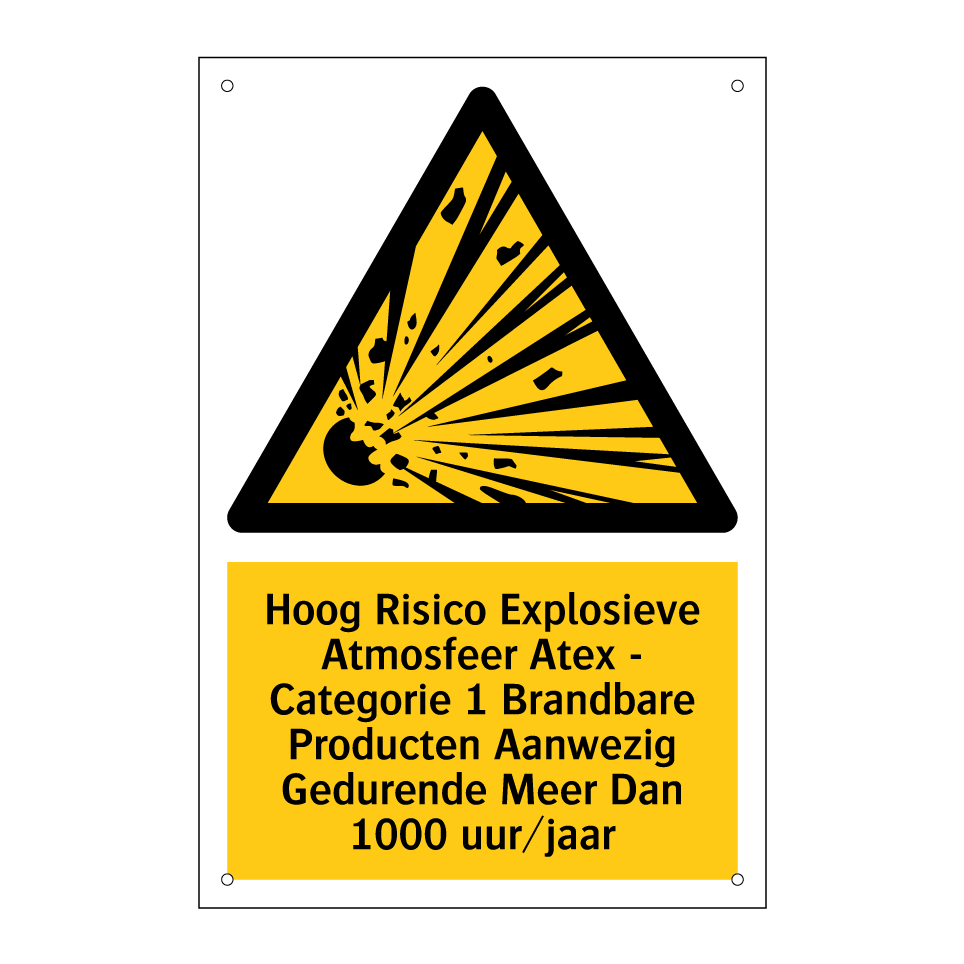 Waarschuwingsbord met de tekst Hoog Risico Explosieve Atmosfeer Atex - Categorie 1 Brandbare Producten Aanwezig Gedurende Meer Dan 1000 uur/jaar