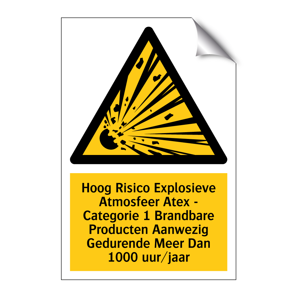 Deze waarschuwingsbord is essentieel voor het markeren van gebieden met een hoog risico op explosieve atmosferen. Het is ontworpen om werknemers en bezoekers te waarschuwen voor de aanwezigheid van brandbare producten gedurende meer dan 1000 uur per jaar. Plaats deze bord op strategische locaties zoals industriële installaties, chemische fabrieken, opslagruimtes voor gevaarlijke stoffen en andere risicovolle omgevingen. Door het duidelijk zichtbaar te maken, helpt het om de veiligheid te waarborgen en ongevallen te voorkomen. Dit waarschuwingsbord is een cruciaal onderdeel van uw veiligheidsmaatregelen en zorgt voor een verhoogd bewustzijn van potentiële gevaren.