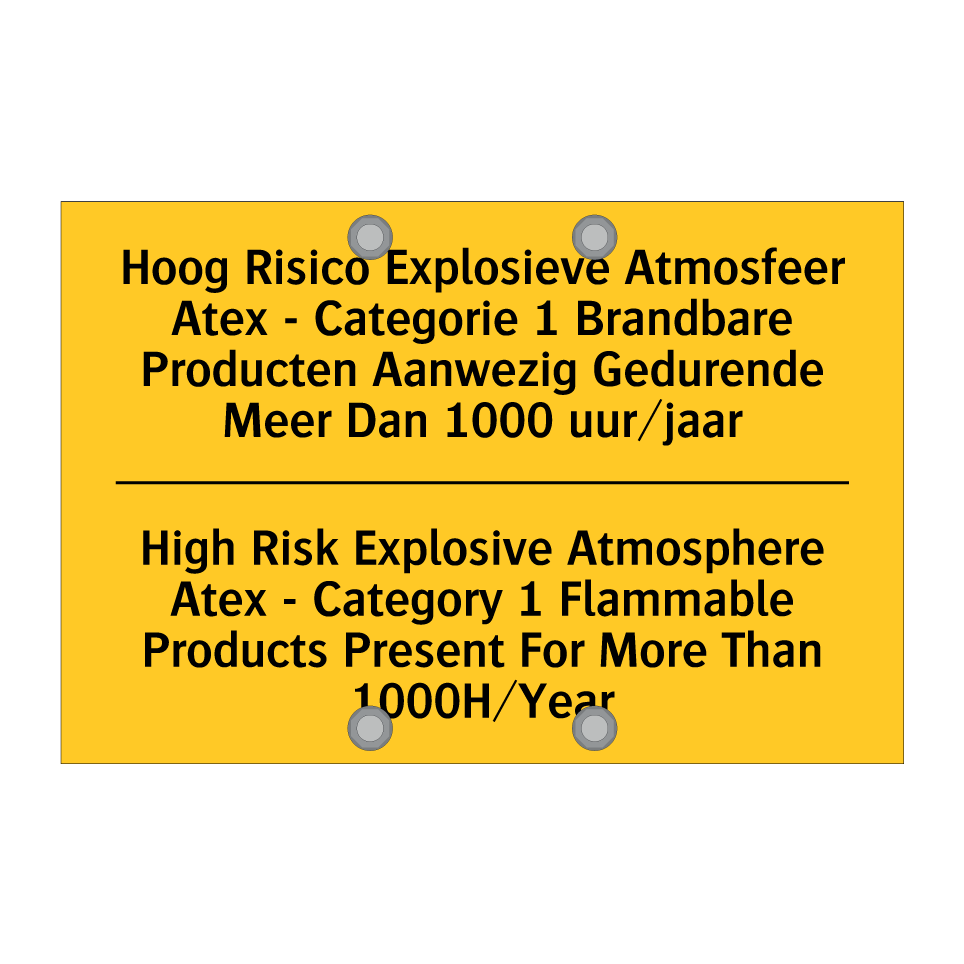 Waarschuwingsbord met de tekst Hoog Risico Explosieve Atmosfeer Atex - Categorie 1 Brandbare Producten Aanwezig Gedurende Meer Dan 1000 uur/jaar / High Risk Explosive Atmosphere Atex - Category 1 Flammable Products Present For More Than 1000H/Year