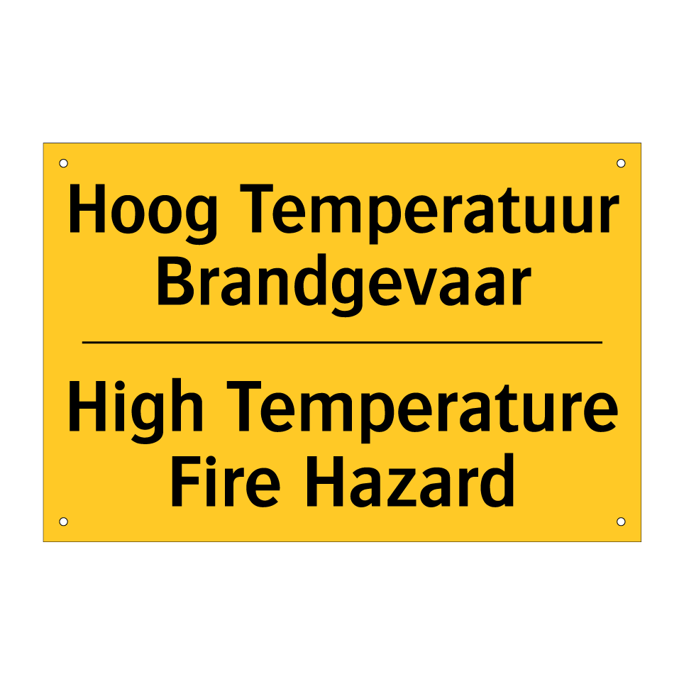 Waarschuwingsbord met de tekst Hoog Temperatuur Brandgevaar / High Temperature Fire Hazard
