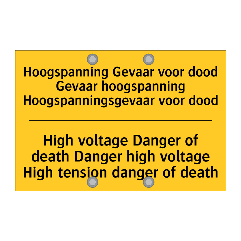 Waarschuwingsbord met de tekst Hoogspanning Gevaar voor dood Gevaar hoogspanning Hoogspanningsgevaar voor dood / High voltage Danger of death Danger high voltage High tension danger of death