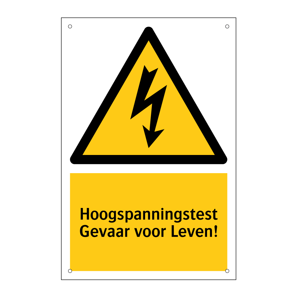 Waarschuwingsbord met de tekst Hoogspanningstest Gevaar voor Leven!