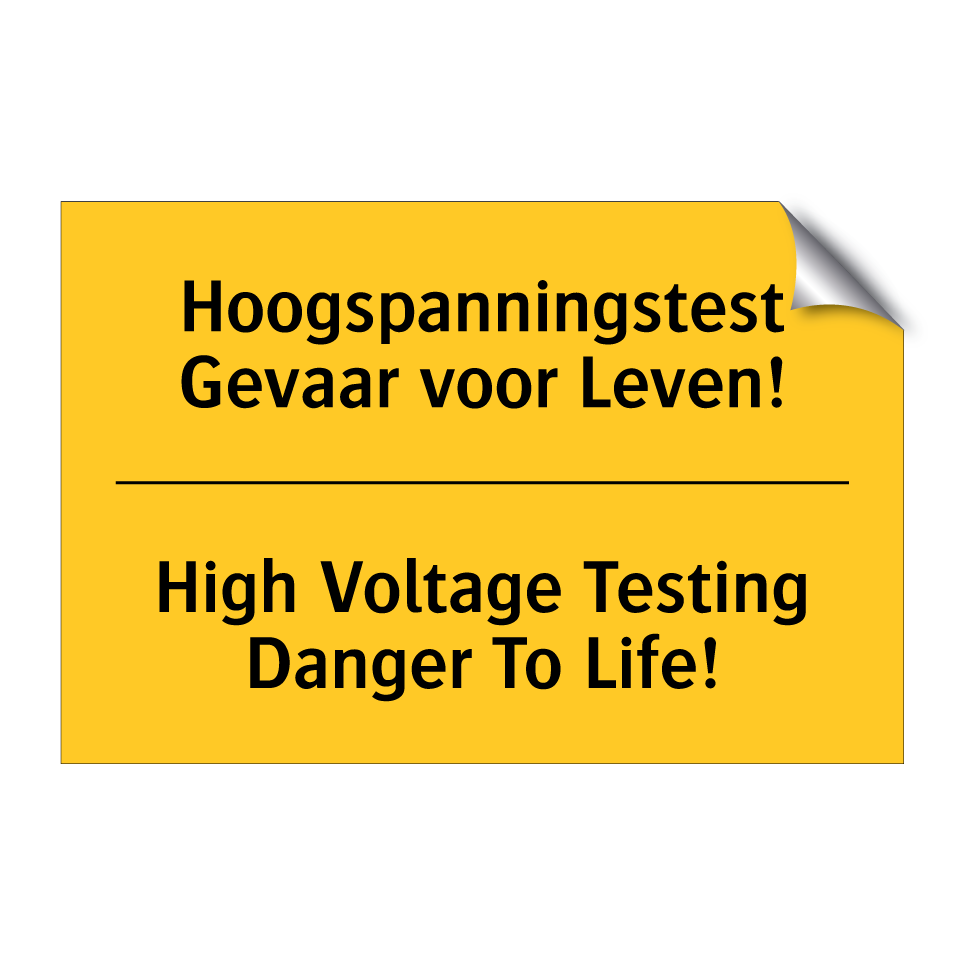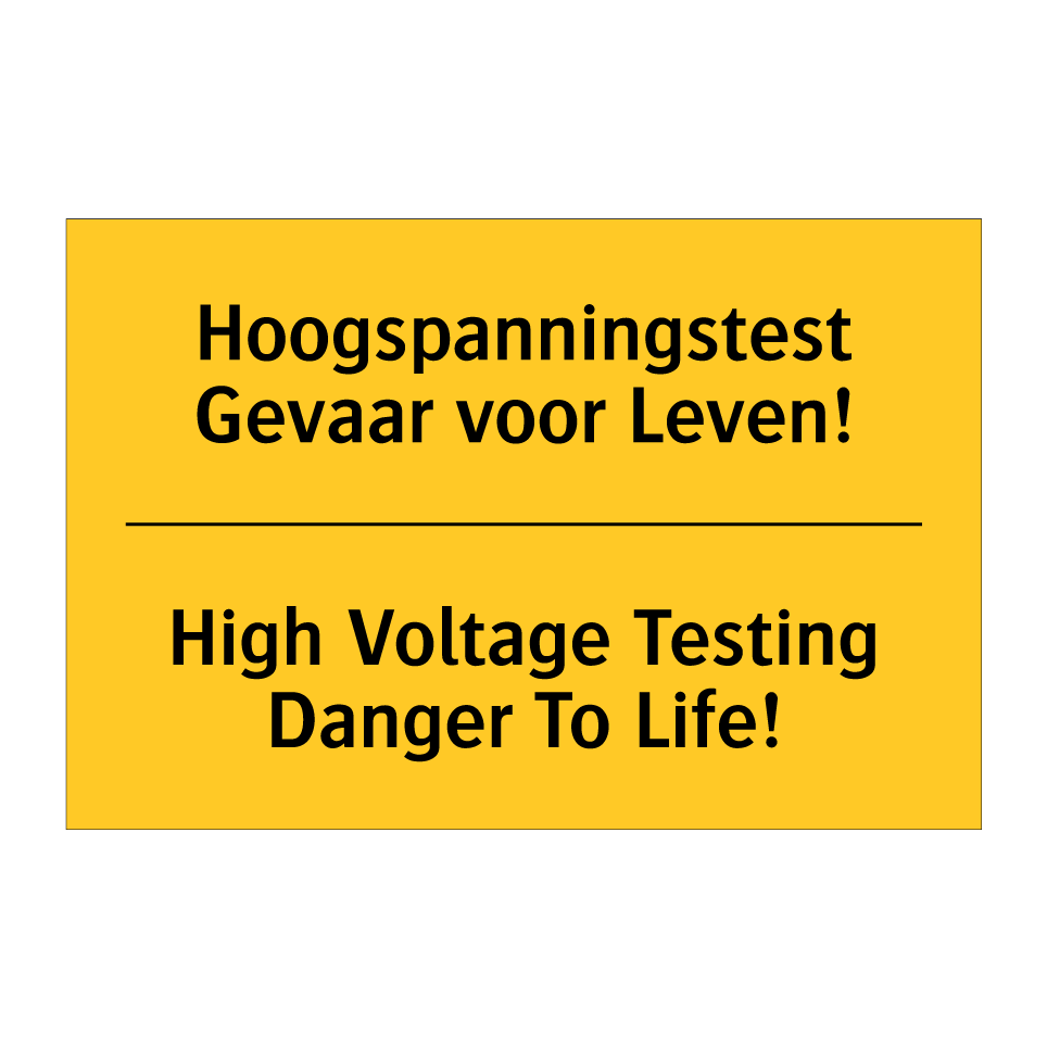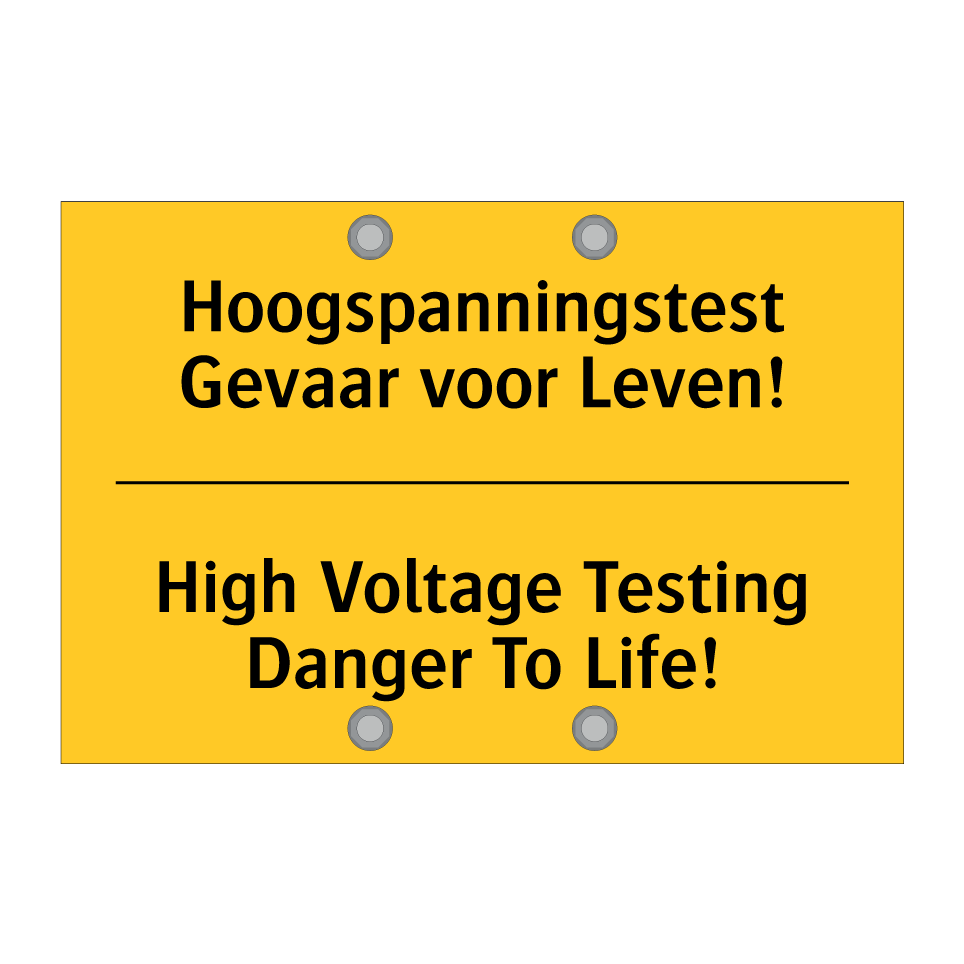 Waarschuwingsbord met de tekst Hoogspanningstest Gevaar voor Leven! / High Voltage Testing Danger To Life!