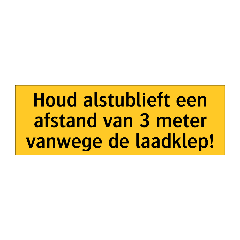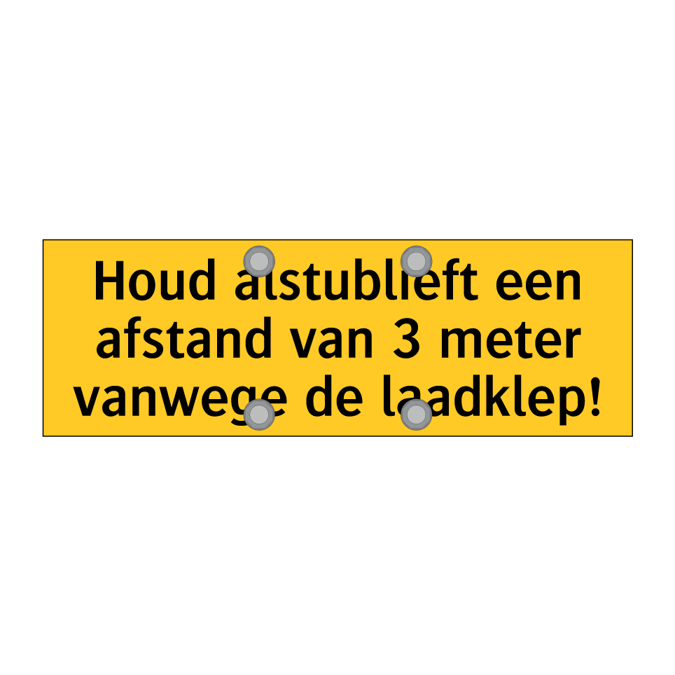 Waarschuwingsbord met de tekst Houd alstublieft een afstand van 3 meter vanwege de laadklep!