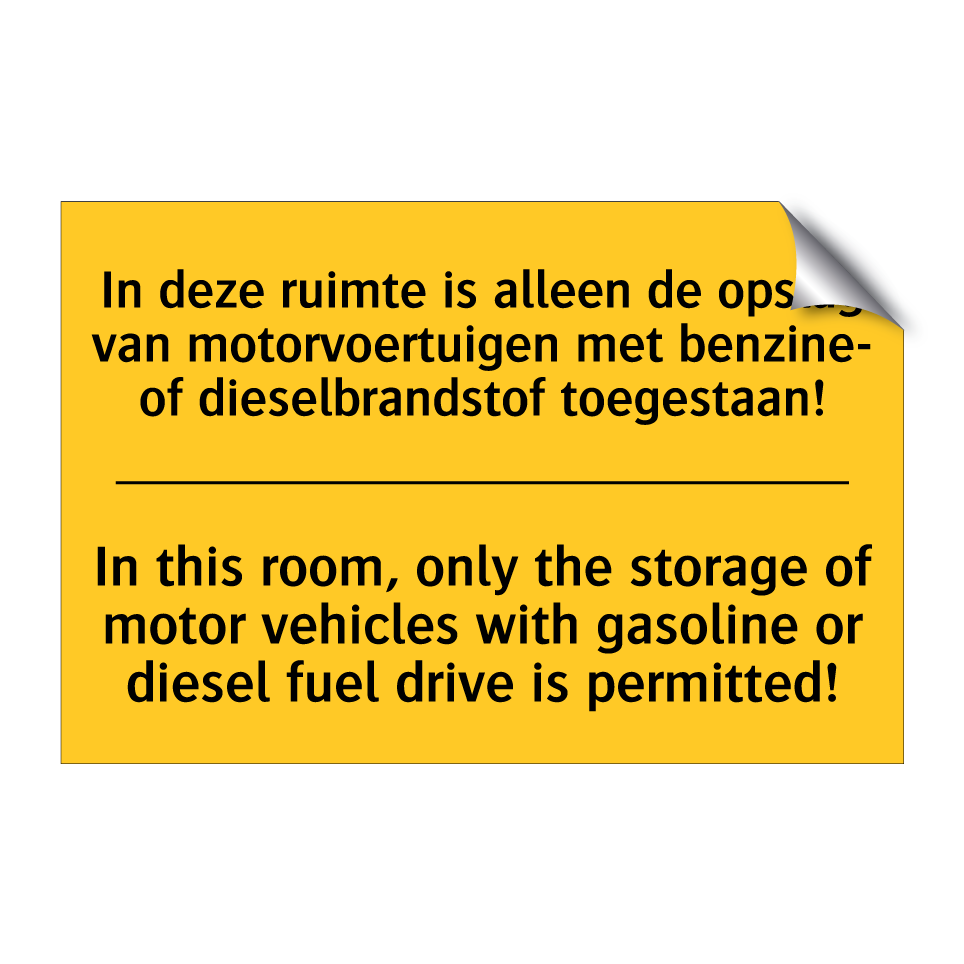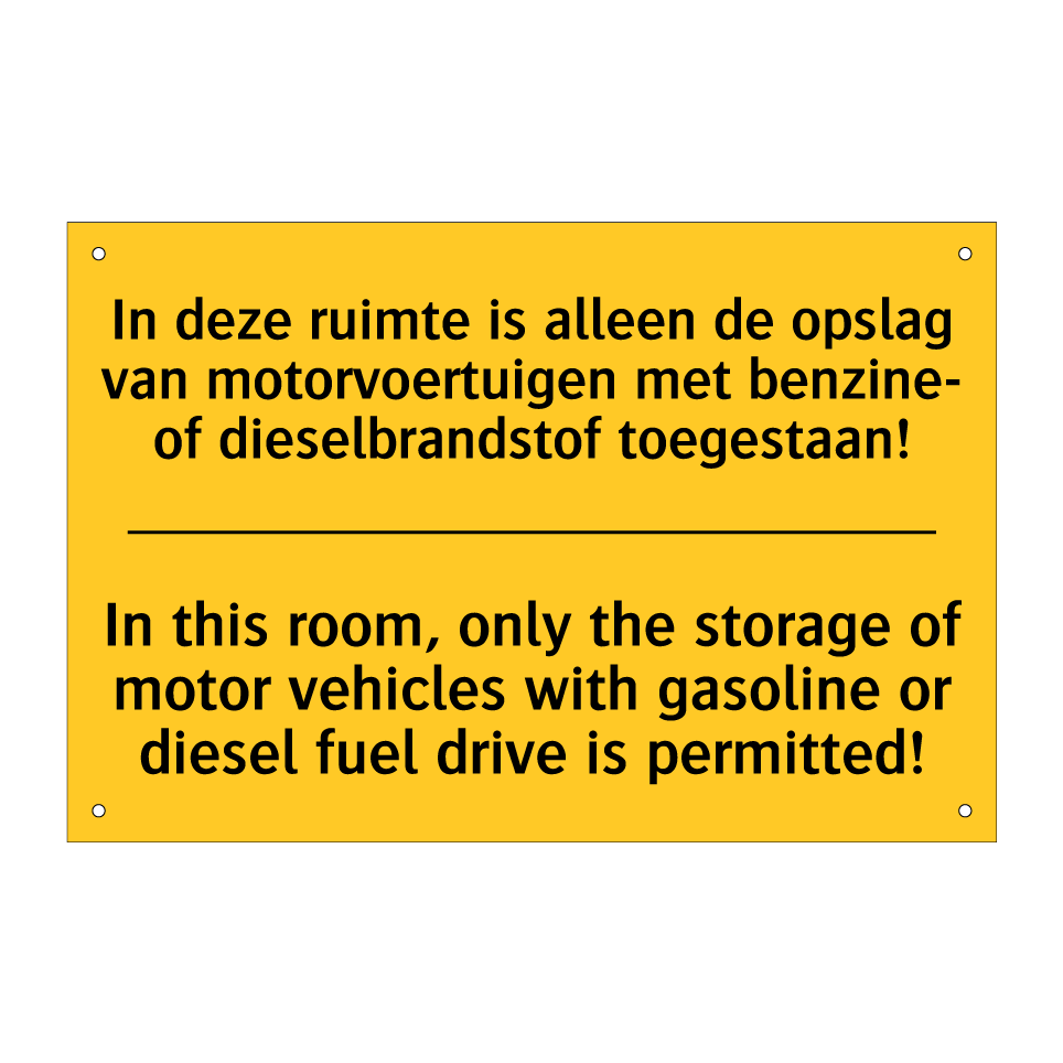 Waarschuwingsbord met de tekst In deze ruimte is alleen de opslag van motorvoertuigen met benzine- of dieselbrandstof toegestaan! / In this room, only the storage of motor vehicles with gasoline or diesel fuel drive is permitted!