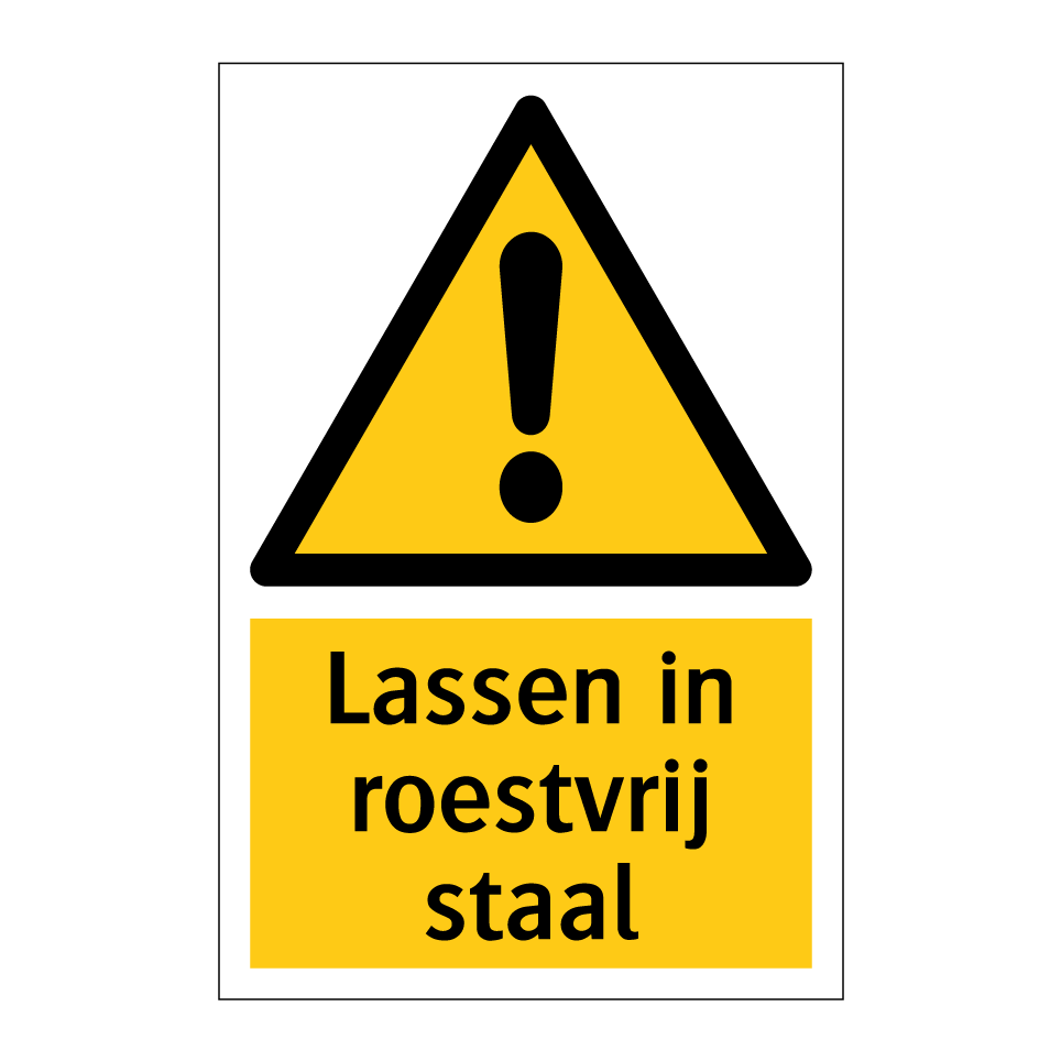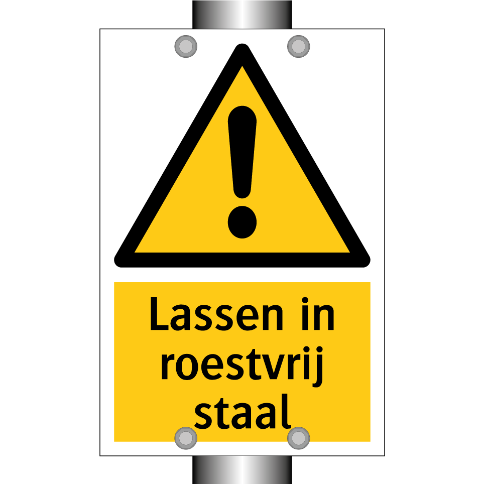 Waarschuwingsbord met de tekst Lassen in roestvrij staal