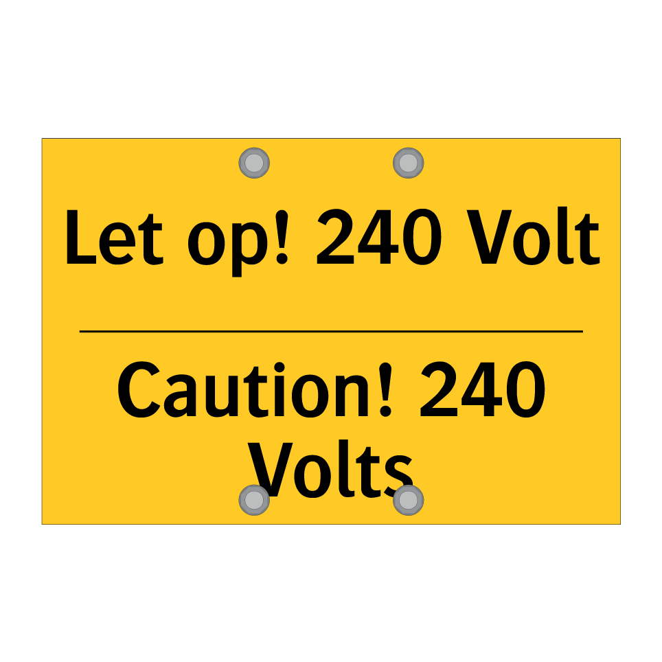 Waarschuwingsbord met de tekst Let op! 240 Volt / Caution! 240 Volts