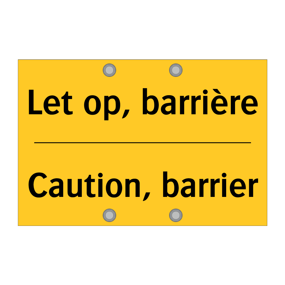Waarschuwingsbord met de tekst Let op, barrière / Caution, barrier
