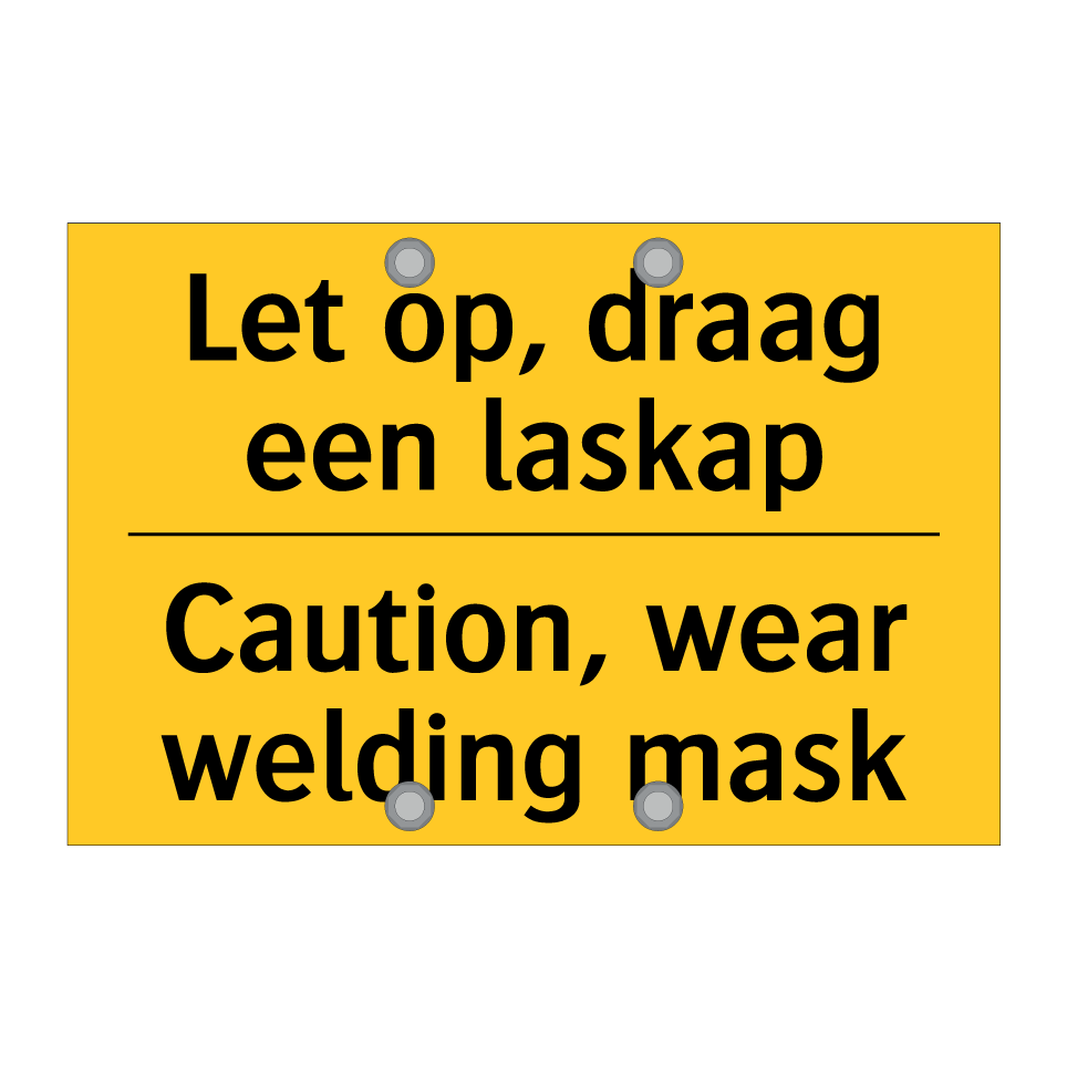 Waarschuwingsbord met de tekst Let op, draag een laskap / Caution, wear welding mask