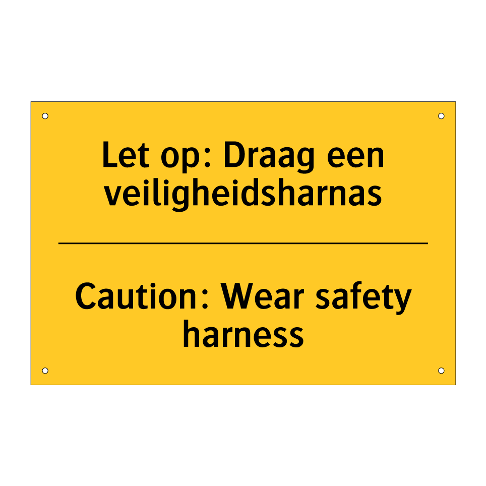 Waarschuwingsbord met de tekst Let op: Draag een veiligheidsharnas / Caution: Wear safety harness
