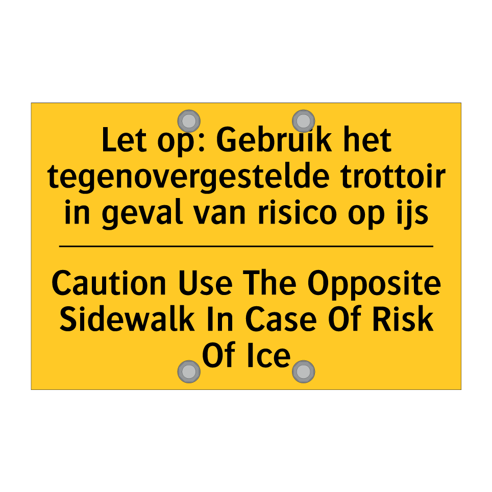 Waarschuwingsbord met de tekst Let op: Gebruik het tegenovergestelde trottoir in geval van risico op ijs / Caution Use The Opposite Sidewalk In Case Of Risk Of Ice