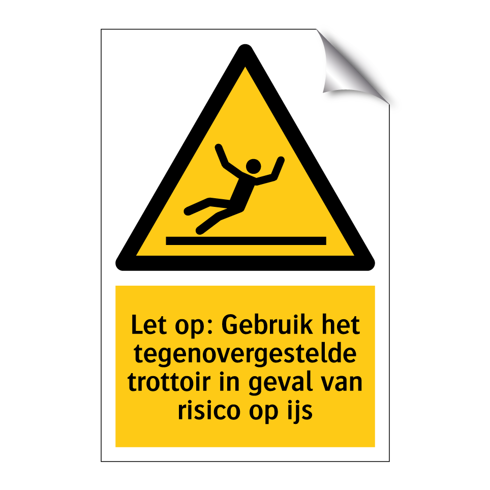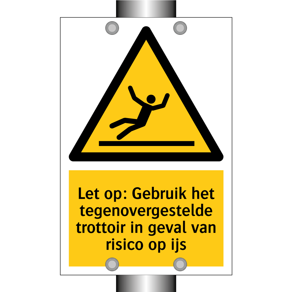 Deze waarschuwingsbord is essentieel voor de veiligheid tijdens koude wintermaanden. Het waarschuwt voetgangers om het tegenoverliggende trottoir te gebruiken bij risico op ijsvorming, waardoor ongelukken en valpartijen voorkomen kunnen worden. Plaats deze bord op strategische locaties zoals trottoirs, ingangen van gebouwen, parkeerplaatsen en andere drukbezochte gebieden waar ijsvorming een gevaar kan vormen. Door deze duidelijke en zichtbare waarschuwing kunnen voetgangers tijdig actie ondernemen en veilig hun weg vervolgen. Ideaal voor gemeenten, bedrijven en openbare instellingen die de veiligheid van hun bezoekers en personeel willen waarborgen.