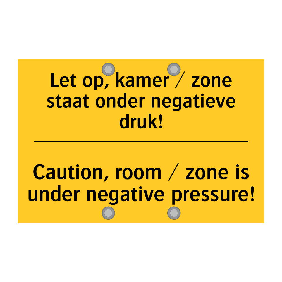 Waarschuwingsbord met de tekst Let op, kamer / zone staat onder negatieve druk! / Caution, room / zone is under negative pressure!