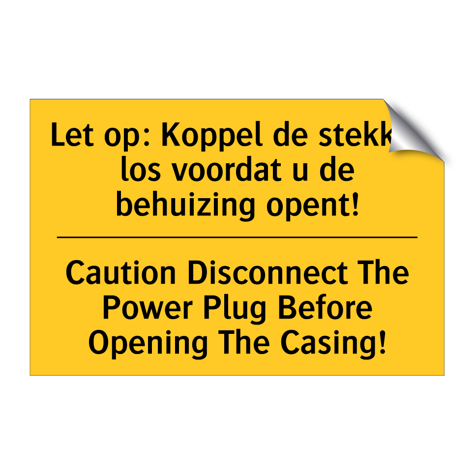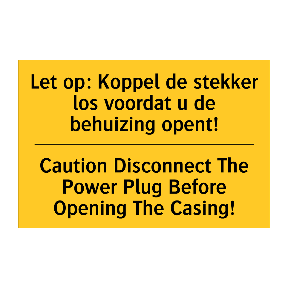 Waarschuwingsbord met de tekst Let op: Koppel de stekker los voordat u de behuizing opent! / Caution Disconnect The Power Plug Before Opening The Casing!